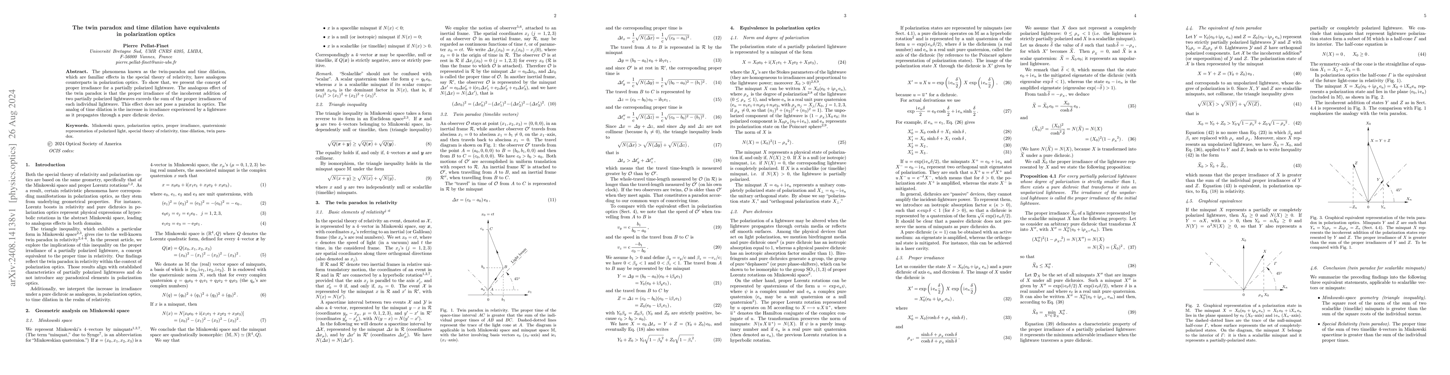 The paper presents an analogy between relativity theory concepts (twin paradox and time dilation) and polarization optics, introducing the concept of proper irradiance for partially polarized lightwaves.