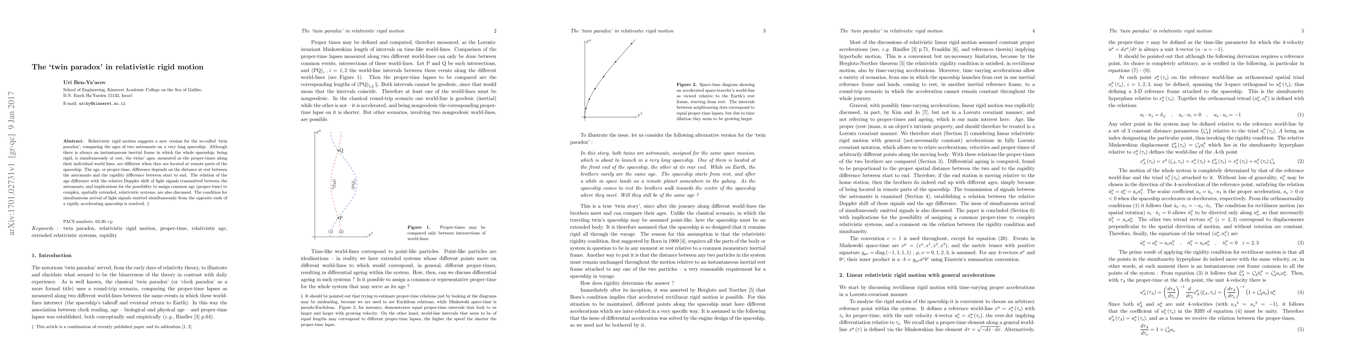 Relativistic rigid motion suggests a new version for the so-called `twin paradox', comparing the ages of two astronauts on a very long spaceship. Although there is always an instantaneous inertial frame in which the whole spaceship, being rigid, is simultaneously at rest, the twins' ages, measured as the proper-times along their individual world lines, are different when they are located at remote parts of the spaceship. The age, or proper-time, difference depends on the distance at rest between the astronauts and the rapidity difference between start to end. The relation of the age difference with the relative Doppler shift of light signals transmitted between the astronauts, and implications for the possibility to assign common age (proper-time) to complex, spatially extended, relativistic systems, are also discussed. The condition for simultaneous arrival of light signals emitted simultaneously from the opposite ends of a rigidly accelerating spaceship is resolved.