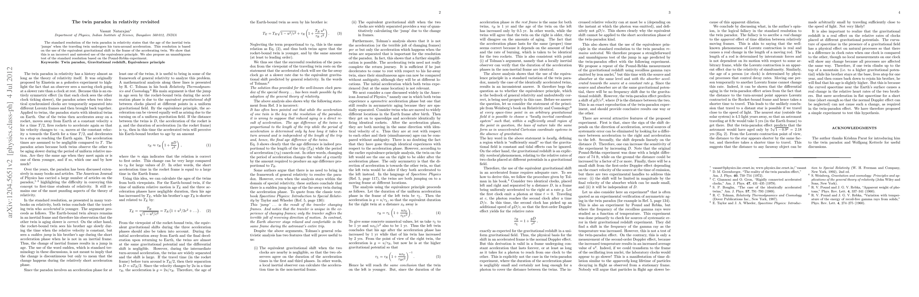 The paper revisits the twin paradox in relativity, proposing a symmetric version where both twins undergo identical acceleration and deceleration, leading to conflicting age predictions. It also suggests an unambiguous test of the standard resolution using the Pound-Rebka experiment.