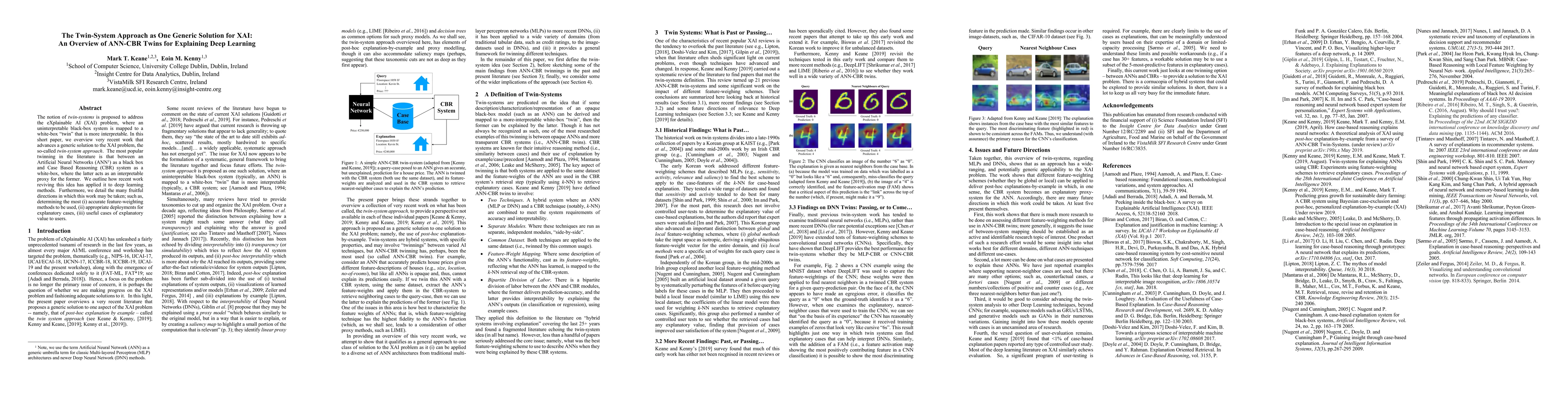 The notion of twin systems is proposed to address the eXplainable AI (XAI) problem, where an uninterpretable black-box system is mapped to a white-box 'twin' that is more interpretable. In this short paper, we overview very recent work that advances a generic solution to the XAI problem, the so called twin system approach. The most popular twinning in the literature is that between an Artificial Neural Networks (ANN ) as a black box and Case Based Reasoning (CBR) system as a white-box, where the latter acts as an interpretable proxy for the former. We outline how recent work reviving this idea has applied it to deep learning methods. Furthermore, we detail the many fruitful directions in which this work may be taken; such as, determining the most (i) accurate feature-weighting methods to be used, (ii) appropriate deployments for explanatory cases, (iii) useful cases of explanatory value to users.