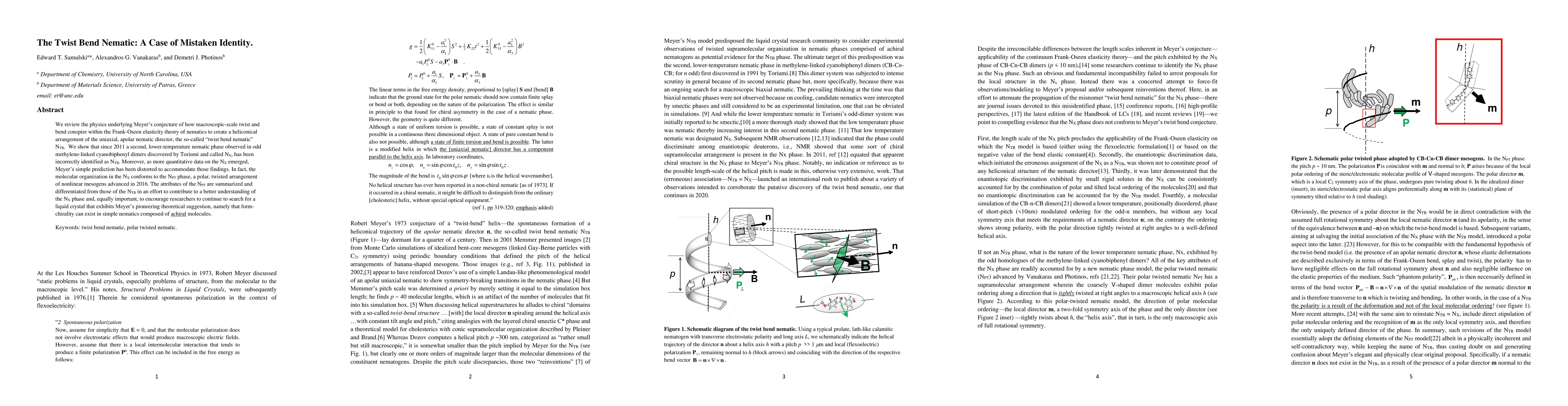 We review the physics underlying Meyer's conjecture of how macroscopic-scale twist and bend conspire within the Frank-Oseen elasticity theory of nematics to create a heliconical arrangement of the uniaxial, apolar nematic director, the so-called "twist bend nematic" $\rm N_{TB}$. We show that since 2011 a second, lower-temperature nematic phase observed in odd methylene-linked cyanobiphenyl dimers discovered by Toriumi and called $\rm N_X$, has been incorrectly identified as $\rm N_{TB}$. Moreover, as more quantitative data on the $\rm N_X$ emerged, Meyer's simple prediction has been distorted to accommodate those findings. In fact, the molecular organization in the $\rm N_X$ conforms to the $\rm N_{PT}$ phase, a polar, twisted arrangement of nonlinear mesogens advanced in 2016. The attributes of the $\rm N_{PT}$ are summarized and differentiated from those of the $\rm N_{TB}$ in an effort to contribute to a better understanding of the $\rm N_X$ phase and, equally important, to encourage researchers to continue to search for a liquid crystal that exhibits Meyer's pioneering theoretical suggestion, namely that form-chirality can exist in simple nematics composed of achiral molecules.