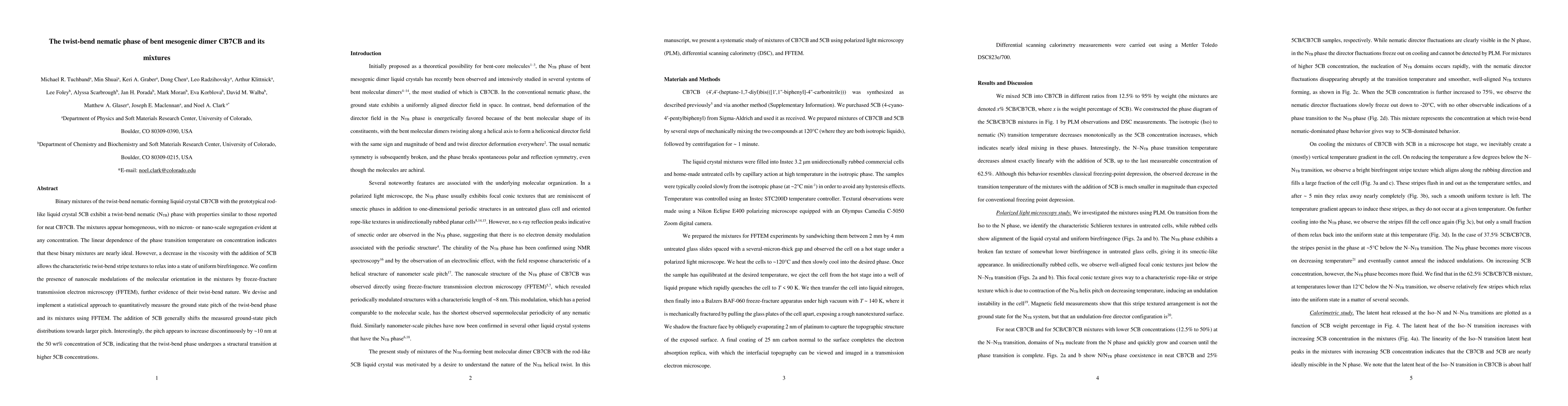 This study investigates binary mixtures of the twist-bend nematic liquid crystal CB7CB with 5CB, revealing nearly ideal behavior and nanoscale modulations in molecular orientation. The mixtures exhibit a structural transition at higher 5CB concentrations, indicated by a discontinuous increase in the twist-bend phase's ground-state pitch.