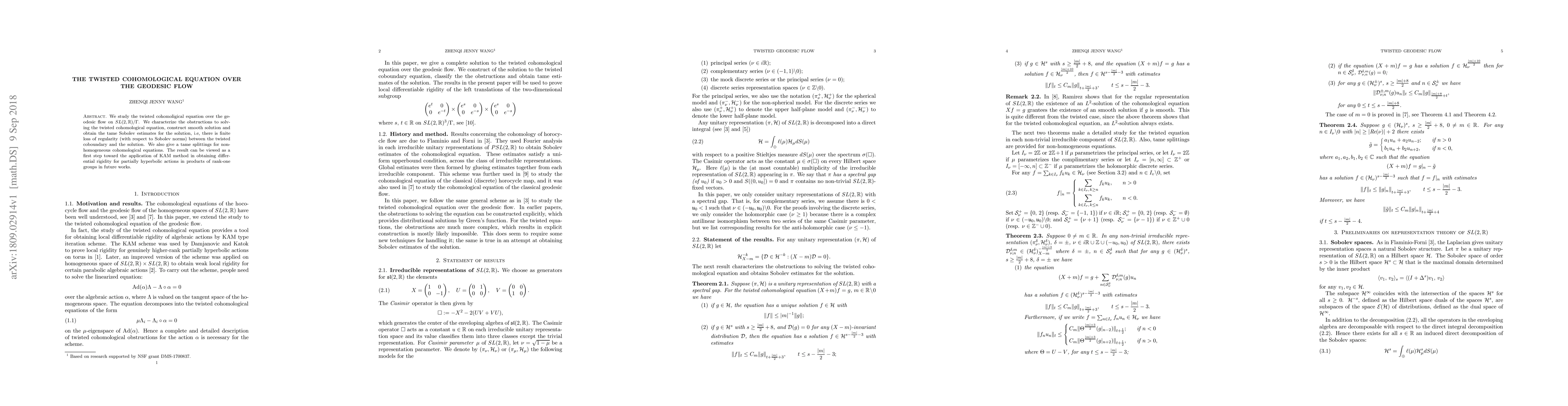 The paper studies the twisted cohomological equation over the geodesic flow on $SL(2,eta)$, characterizing obstructions and obtaining tame Sobolev estimates for a solution, which could lead to differential rigidity in partially hyperbolic actions.