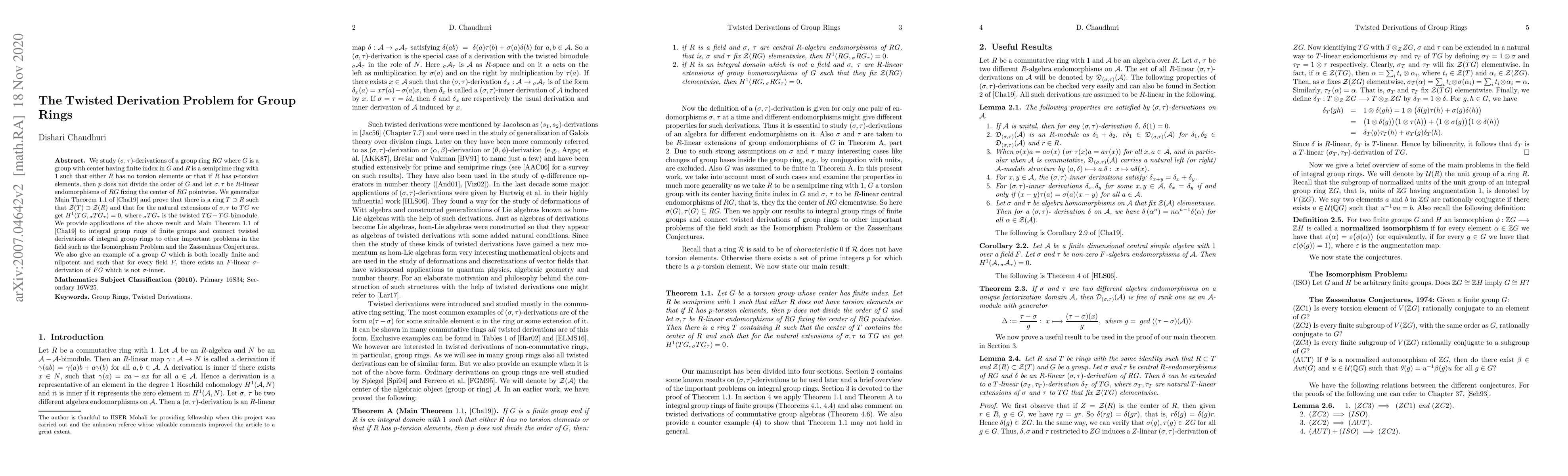 This paper investigates $(\sigma,\tau)$-derivations in group rings $RG$ where $G$ has a finite-index center, and $R$ is a semiprime ring with specific torsion conditions. It generalizes a previous theorem and proves that there exists a ring $T$ extending $R$ such that $H^1(TG,{}_\sigma TG_\tau)=0$, connecting these results to the Isomorphism Problem and Zassenhaus Conjectures.