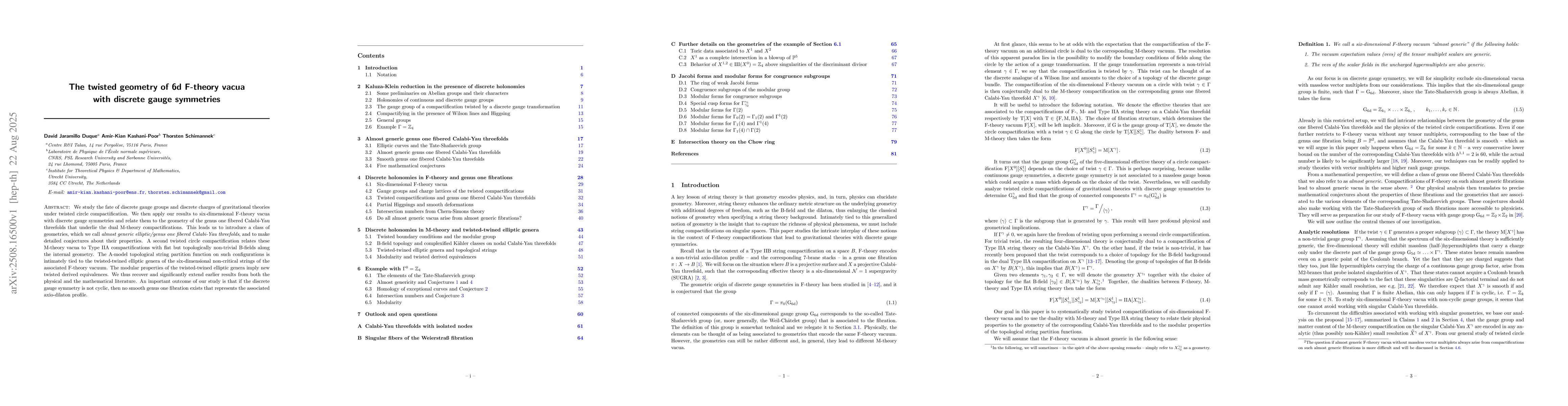 We study the fate of discrete gauge groups and discrete charges of gravitational theories under twisted circle compactification. We then apply our results to six-dimensional F-theory vacua with discrete gauge symmetries and relate them to the geometry of the genus one fibered Calabi-Yau threefolds that underlie the dual M-theory compactifications. This leads us to introduce a class of geometries, which we call almost generic elliptic/genus one fibered Calabi-Yau threefolds, and to make detailed conjectures about their properties. A second twisted circle compactification relates these M-theory vacua to Type IIA compactifications with flat but topologically non-trivial B-fields along the internal geometry. The A-model topological string partition function on such configurations is intimately tied to the twisted-twined elliptic genera of the six-dimensional non-critical strings of the associated F-theory vacuum. The modular properties of the twisted-twined elliptic genera imply new twisted derived equivalences. We thus recover and significantly extend earlier results from both the physical and the mathematical literature. An important outcome of our study is that if the discrete gauge symmetry is not cyclic, then no smooth genus one fibration exists that represents the associated axio-dilaton profile.