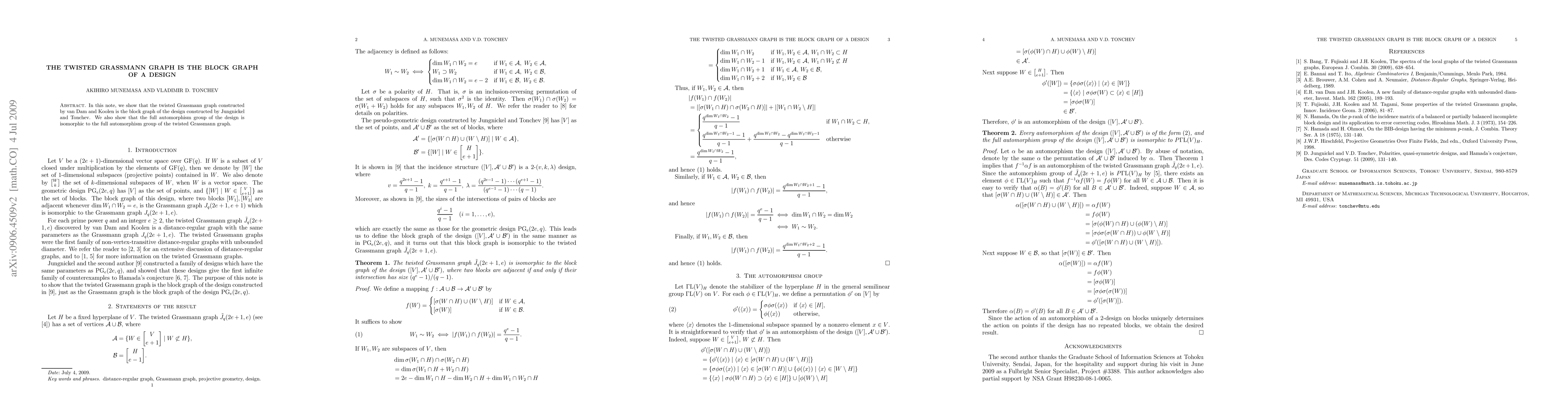 In this note, we show that the twisted Grassmann graph constructed by van Dam and Koolen is the block graph of the design constructed by Jungnickel and Tonchev. We also show that the full automorphism group of the design is isomorphic to the full automorphism group of the twisted Grassmann graph.