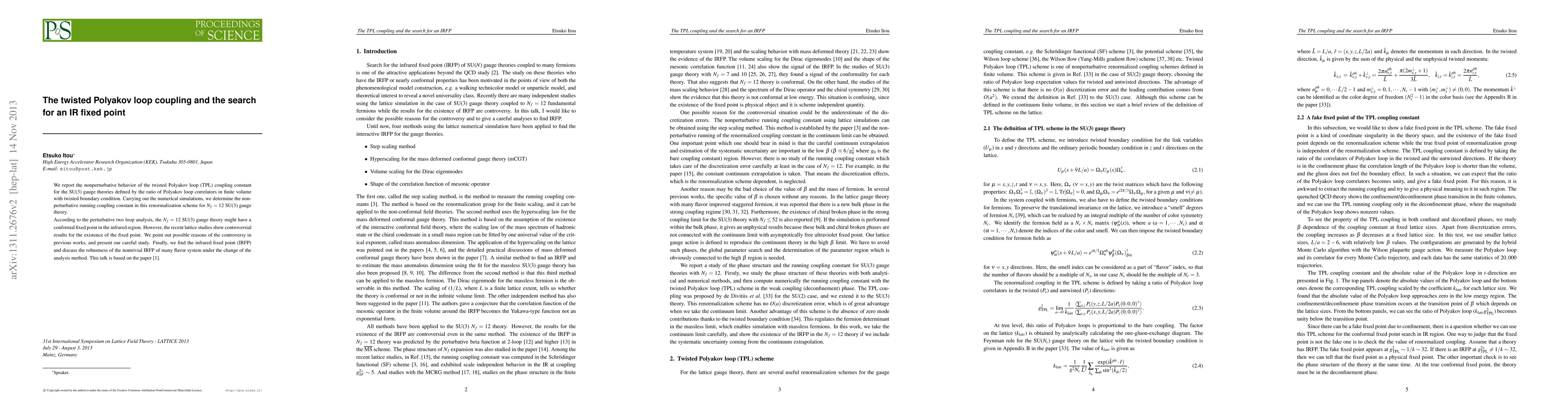 We report the nonperturbative behavior of the twisted Polyakov loop (TPL) coupling constant for the SU(3) gauge theories defined by the ratio of Polyakov loop correlators in finite volume with twisted boundary condition. Carrying out the numerical simulations, we determine the nonperturbative running coupling constant in this renormalization scheme for Nf=12 SU(3) gauge theory. According to the perturbative two loop analysis, the Nf=12 SU(3) gauge theory might have a conformal fixed point in the infrared region. However, the recent lattice studies show controversial results for the existence of the fixed point. We point out possible reasons of the controversy in previous works, and present our careful study. Finally, we find the infrared fixed point (IRFP) and discuss the robustness of the nontrivial IRFP of many flavor system under the change of the analysis method. This talk is based on the paper[1].