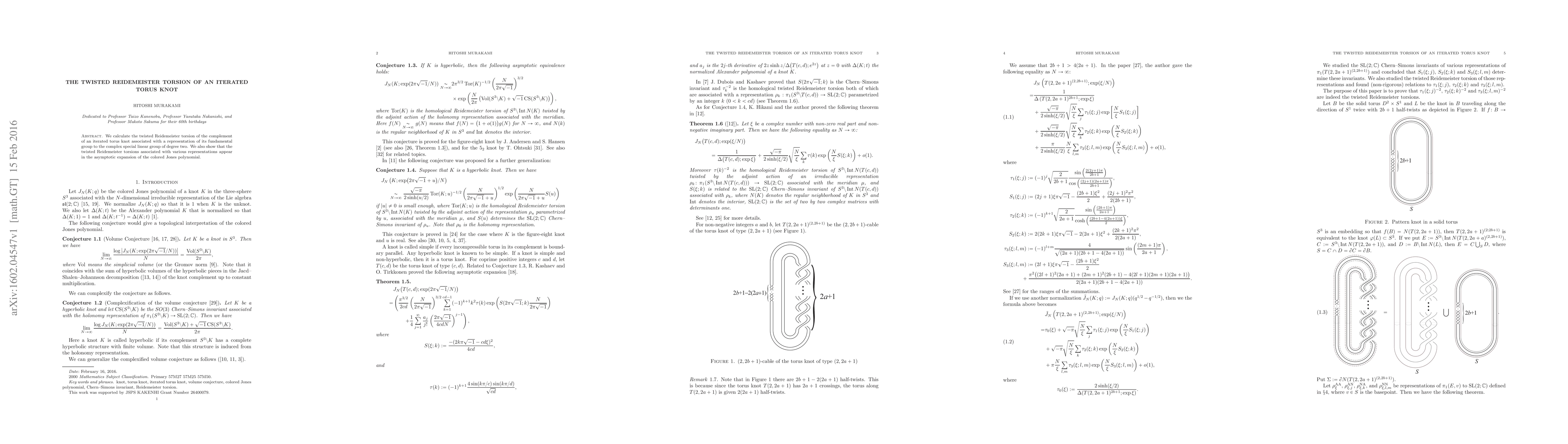 Summary: This paper computes the twisted Reidemeister torsion for iterated torus knots with specific representations, and demonstrates its connection to the asymptotic expansion of the colored Jones polynomial.