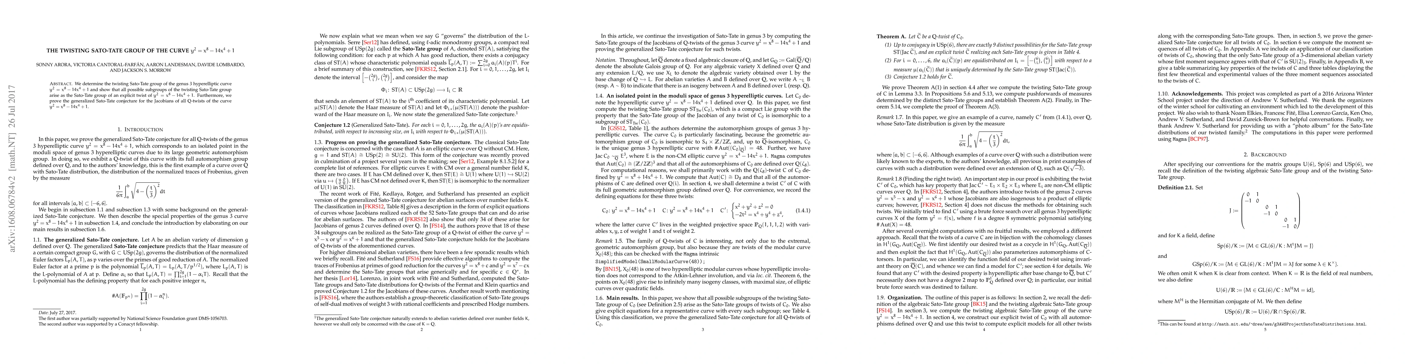 The paper determines the twisting Sato-Tate group of the genus 3 hyperelliptic curve y^2 = x^8 - 14x^4 + 1 and proves the generalized Sato-Tate conjecture for the Jacobians of all Q-twists of the curve.