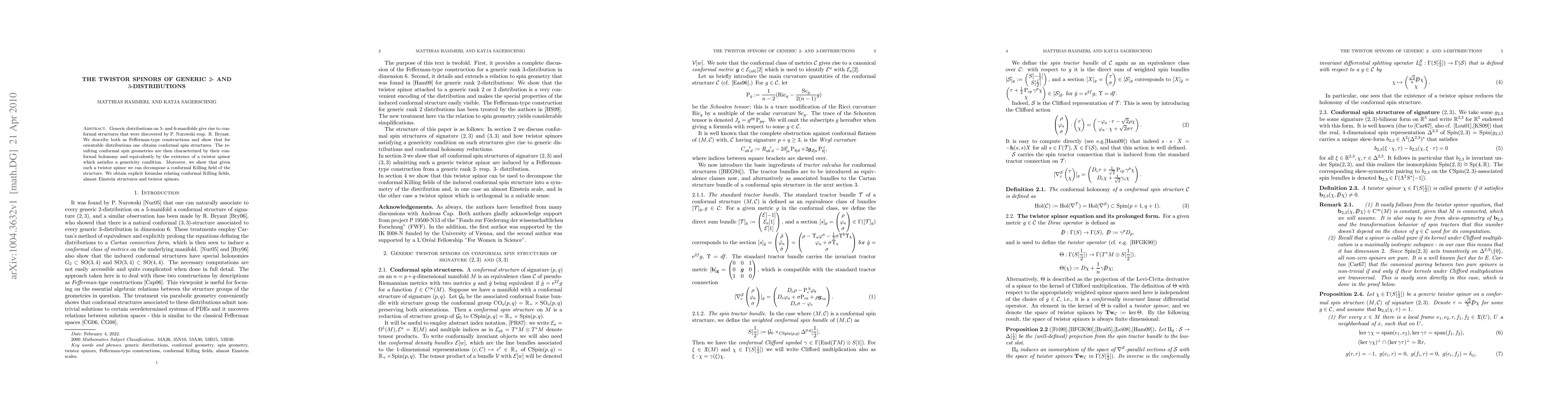 This paper explores the relationship between generic 2- and 3-distributions on 5- and 6-manifolds and their associated conformal structures, demonstrating that these structures can be constructed via Fefferman-type methods. It characterizes the resulting conformal spin geometries by their holonomy and the existence of twistor spinors, providing explicit formulas linking conformal Killing fields, almost Einstein structures, and twistor spinors.