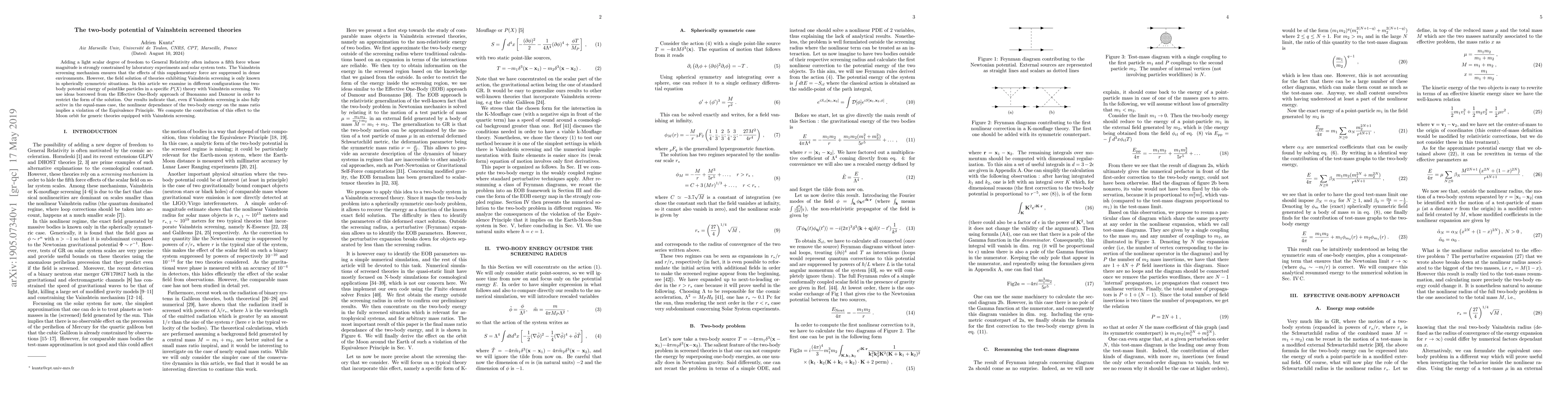 Adding a light scalar degree of freedom to General Relativity often induces a fifth force whose magnitude is strongly constrained by laboratory experiments and solar system tests. The Vainshtein screening mechanism ensures that the effects of this supplementary force are suppressed in dense environments. However, the field solution of theories exhibiting Vainshtein screening is only known in spherically symmetric situations. In this article we examine in different configurations the two-body potential energy of pointlike particles in a specific $P(X)$ theory with Vainshtein screening. We use ideas borrowed from the Effective One-Body approach of Buonanno and Damour in order to restrict the form of the solution. Our results indicate that, even if Vainshtein screening is also fully active in the equal-mass case, the nonlinear dependance of the two-body energy on the mass ratio implies a violation of the Equivalence Principle. We compute the contribution of this effect to the Moon orbit for generic theories equipped with Vainshtein screening.