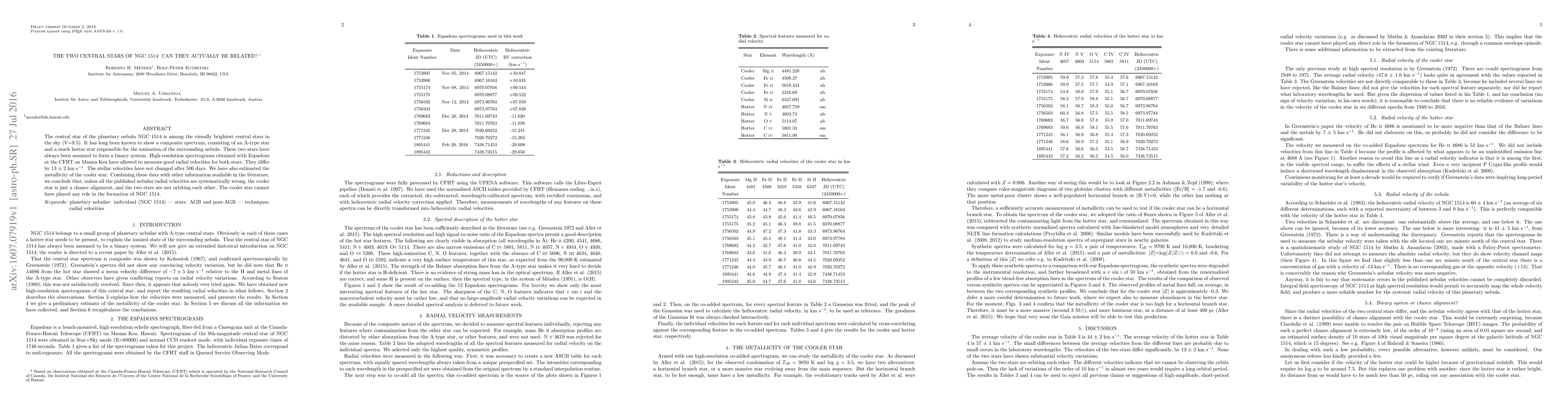 High-resolution spectroscopic analysis of NGC 1514's central stars reveals a 13 km/s radial velocity difference, previously assumed to indicate a binary system. However, the stability of this difference over 500 days and the cooler star's metallicity suggest they are a chance alignment, not orbiting each other, with the cooler star playing no role in NGC 1514's formation.