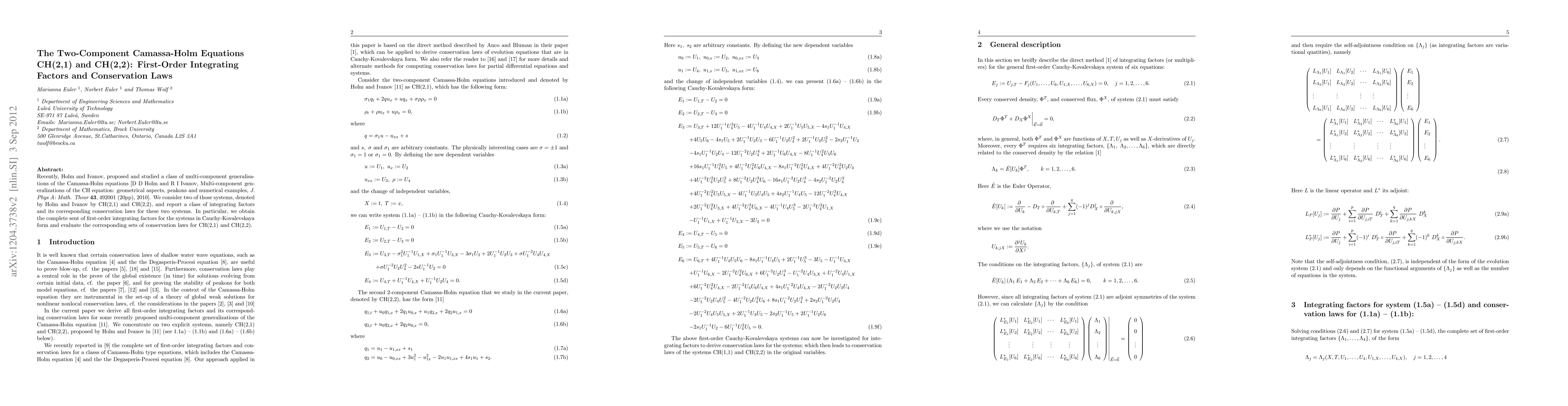 This paper investigates first-order integrating factors for the two-component Camassa-Holm equations CH(2,1) and CH(2,2), deriving a complete set of these factors and corresponding conservation laws for both systems.