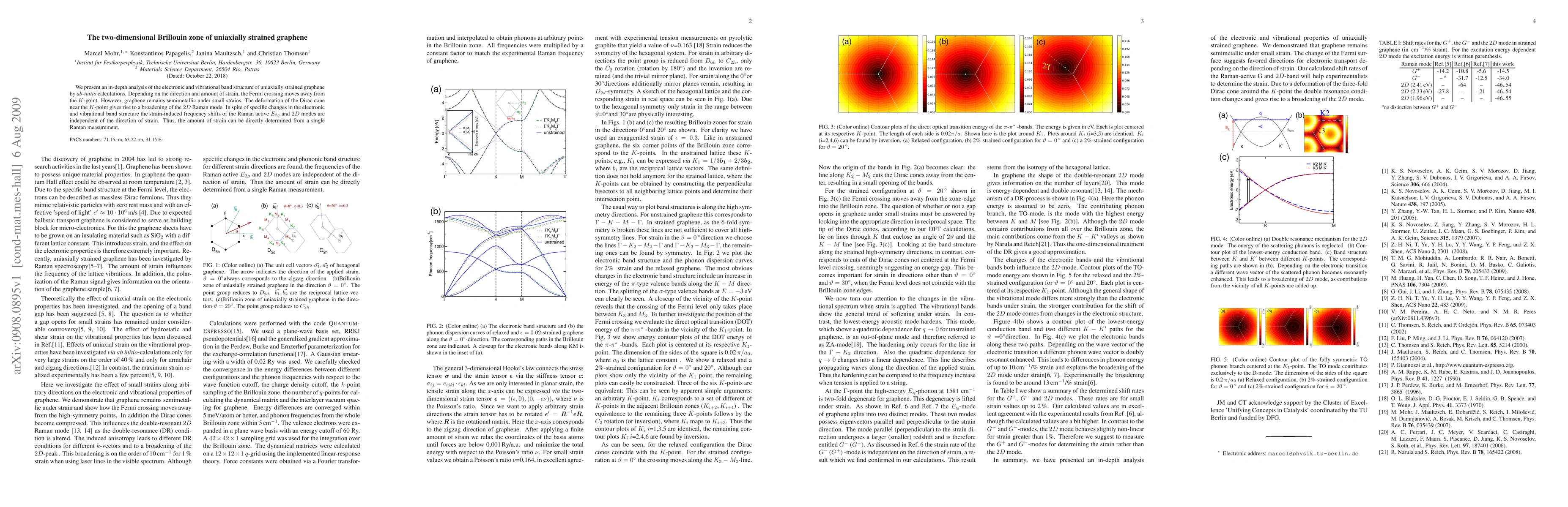 A detailed analysis of the electronic and vibrational properties of uniaxially strained graphene, including calculated shifterates for G+, G-, and 2D modes.