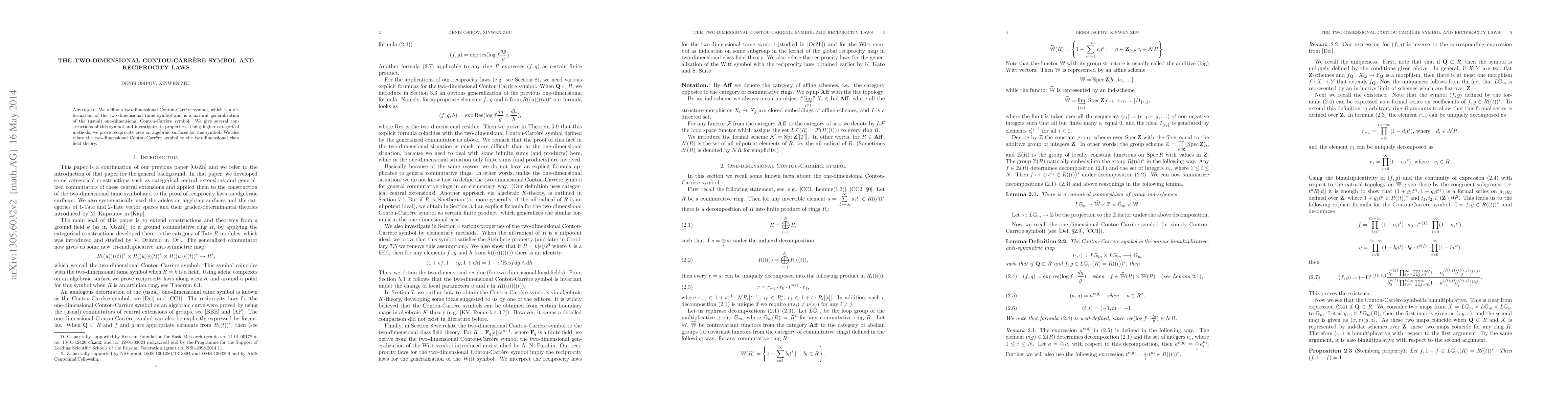 This paper introduces a two-dimensional Contou-Carrère symbol, a generalization of the one-dimensional version, and explores its properties and constructions. It also establishes reciprocity laws on algebraic surfaces using higher categorical methods and connects the symbol to two-dimensional class field theory.