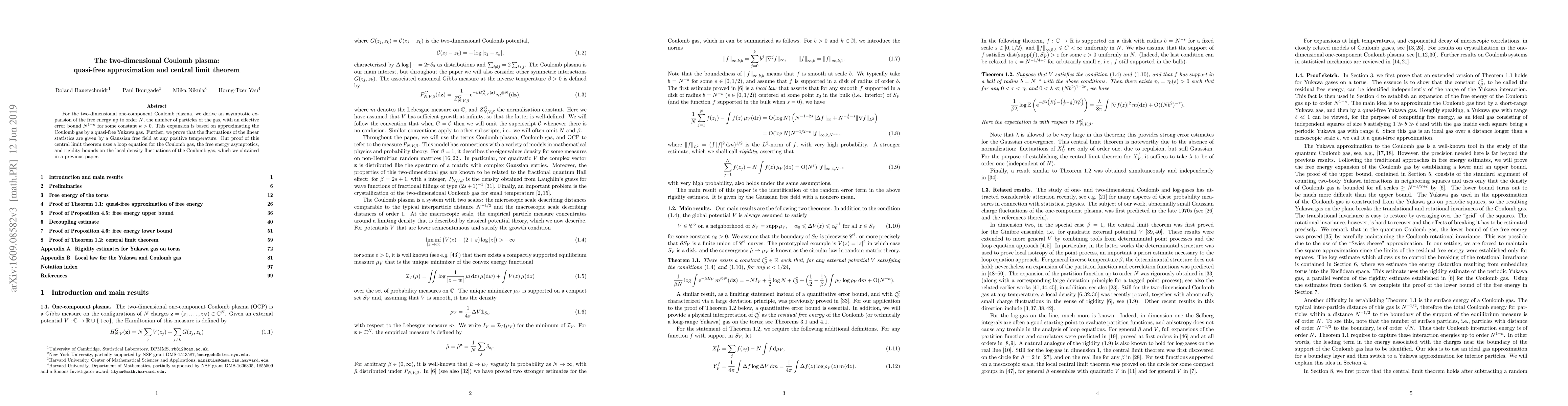 For the two-dimensional one-component Coulomb plasma, we derive an asymptotic expansion of the free energy up to order $N$, the number of particles of the gas, with an effective error bound $N^{1-\kappa}$ for some constant $\kappa > 0$. This expansion is based on approximating the Coulomb gas by a quasi-free Yukawa gas. Further, we prove that the fluctuations of the linear statistics are given by a Gaussian free field at any positive temperature. Our proof of this central limit theorem uses a loop equation for the Coulomb gas, the free energy asymptotics, and rigidity bounds on the local density fluctuations of the Coulomb gas, which we obtained in a previous paper.