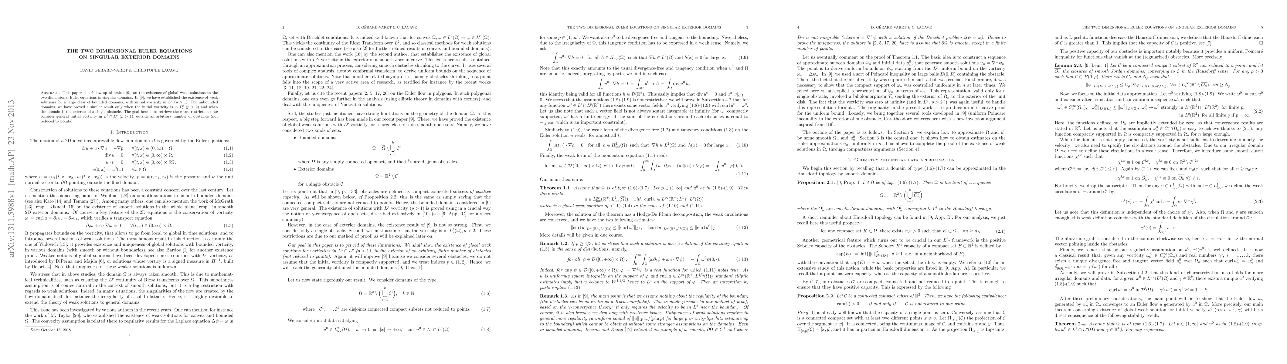 This paper is a follow-up of article [Gerard-Varet and Lacave, ARMA 2013], on the existence of global weak solutions to the two dimensional Euler equations in singular domains. In [Gerard-Varet and Lacave, ARMA 2013], we have established the existence of weak solutions for a large class of bounded domains, with initial vorticity in $L^p$ ($p>1$). For unbounded domains, we have proved a similar result only when the initial vorticity is in $L^p_{c}$ ($p>2$) and when the domain is the exterior of a single obstacle. The goal here is to retrieve these two restrictions: we consider general initial vorticity in $L^1\cap L^p$ ($p>1$), outside an arbitrary number of obstacles (not reduced to points).