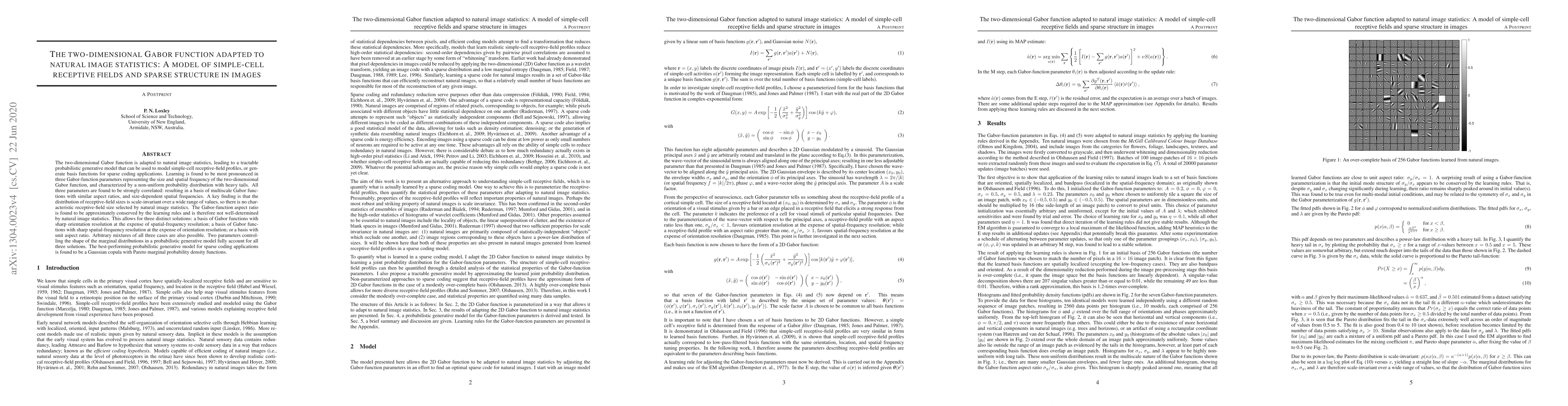 The two-dimensional Gabor function is adapted to natural image statistics, leading to a tractable probabilistic generative model that can be used to model simple-cell receptive-field profiles, or generate basis functions for sparse coding applications. Learning is found to be most pronounced in three Gabor-function parameters representing the size and spatial frequency of the two-dimensional Gabor function, and characterized by a non-uniform probability distribution with heavy tails. All three parameters are found to be strongly correlated: resulting in a basis of multiscale Gabor functions with similar aspect ratios, and size-dependent spatial frequencies. A key finding is that the distribution of receptive-field sizes is scale-invariant over a wide range of values, so there is no characteristic receptive-field size selected by natural image statistics. The Gabor-function aspect ratio is found to be approximately conserved by the learning rules and is therefore not well-determined by natural image statistics. This allows for three distinct solutions: a basis of Gabor functions with sharp orientation resolution at the expense of spatial-frequency resolution; a basis of Gabor functions with sharp spatial-frequency resolution at the expense of orientation resolution; or a basis with unit aspect ratio. Arbitrary mixtures of all three cases are also possible. Two parameters controlling the shape of the marginal distributions in a probabilistic generative model fully account for all three solutions. The best-performing probabilistic generative model for sparse coding applications is found to be a Gaussian copula with Pareto marginal probability density functions.