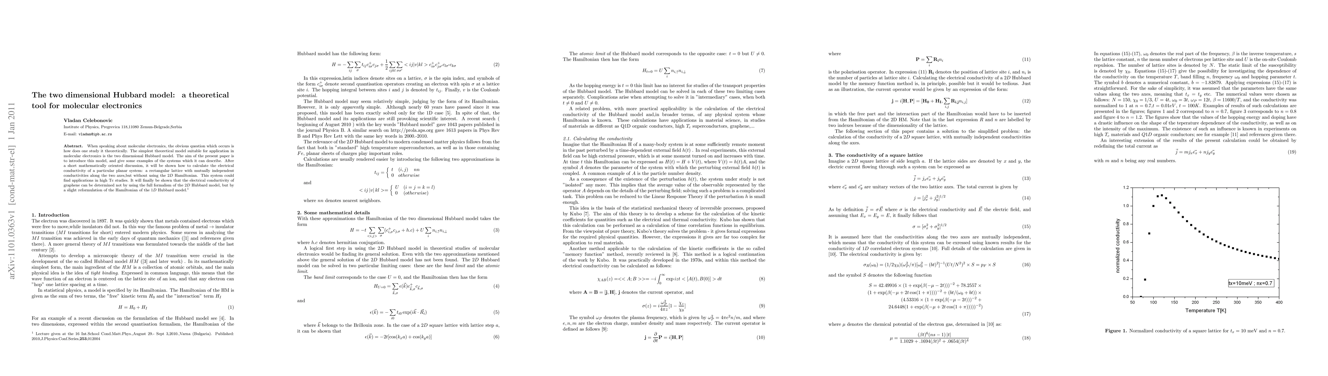 When speaking about molecular electronics, the obvious question which occurs is how does one study it theoretically. The simplest theoretical model suitable for application in molecular electronics is the two dimensional Hubbard model. The aim of the present paper is to introduce this model, and give some examples of the systems which it can describe. After a short mathematically oriented discussion, it will be shown how to calculate the electrical conductivity of a particular planar system: a rectangular lattice with mutually independent conductivities along the two axes,but without using the 2D Hamiltonian. This system could find applications in high Tc studies. It will finally be shown that the electrical conductivity of graphene can be determined not by using the full formalism of the $2D$ Hubbard model, but by a slight reformulation of the Hamiltonian of the 1D Hubbard model