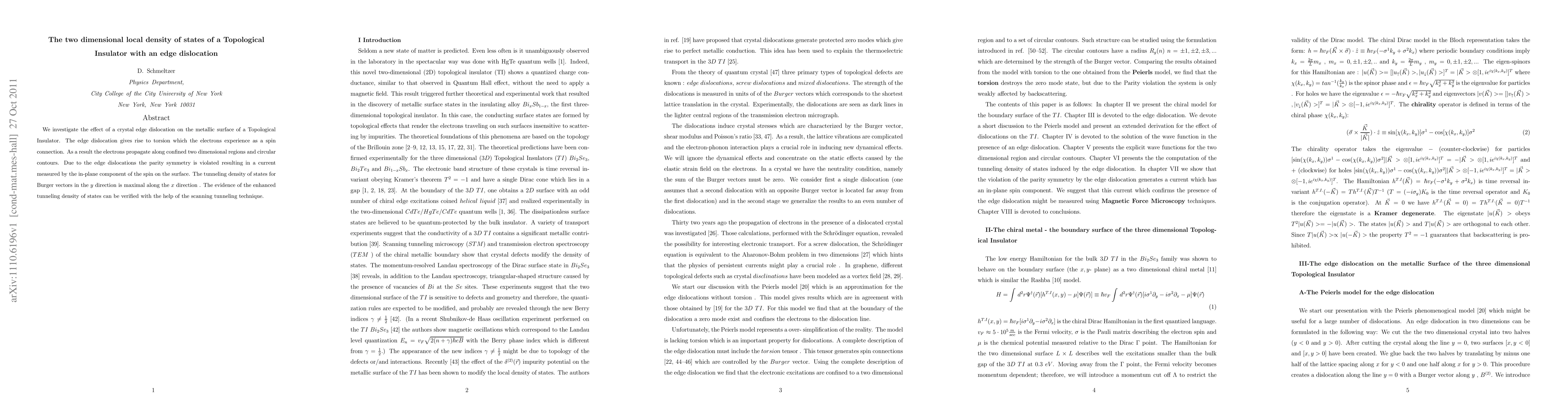 We investigate the effect of a crystal edge dislocation on the metallic surface of a Topological Insulator. The edge dislocation gives rise to torsion which the electrons experience as a spin connection. As a result the electrons propagate along confined two dimensional regions and circular contours. Due to the edge dislocations the parity symmetry is violated resulting in a current measured by the in-plane component of the spin on the surface. The tunneling density of states for Burger vectors in the $y$ direction is maximal along the $x$ direction. The evidence of the enhanced tunneling density of states can be verified with the help of the scanning tunneling technique.