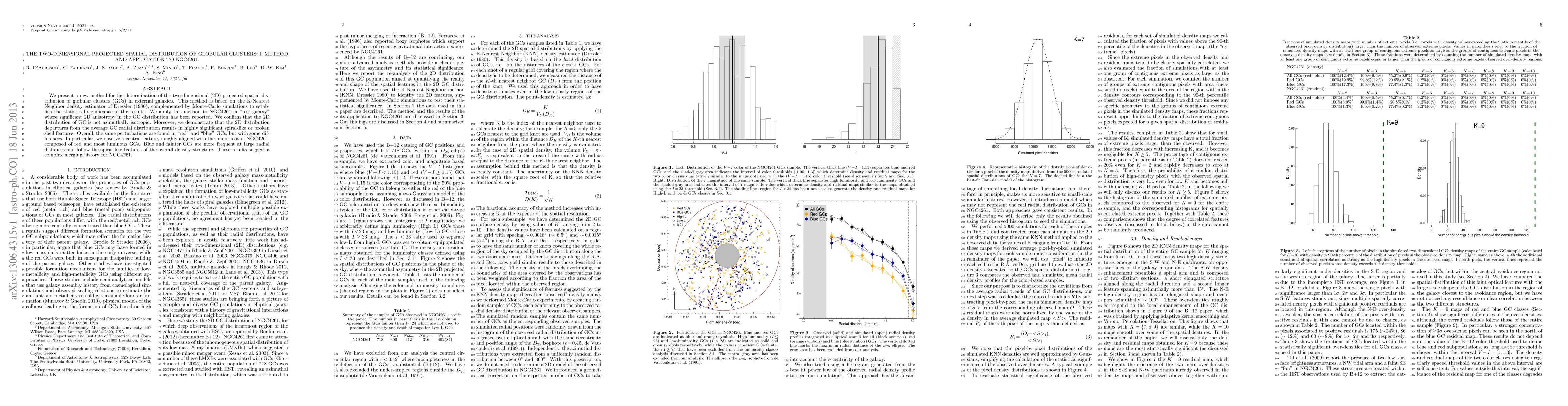 We present a new method for the determination of the two-dimensional (2D) projected spatial distribution of globular clusters (GCs) in external galaxies. This method is based on the K-Nearest Neighbor density estimator of Dressler (1980), complemented by MonteCarlo simulations to establish the statistical significance of the results. We apply this method to NGC4261, a "test galaxy" where significant 2D anisotropy in the GC distribution has been reported. We confirm that the 2D distribution of GC is not azimuthally isotropic. Moreover, we demonstrate that the 2D distribution departures from the average GC radial distribution results in highly significant spiral-like or broken shell features. Overall, the same perturbations are found in "red" and "blue" GCs, but with some differences. In particular, we observe a central feature, roughly aligned with the minor axis of NGC4261, composed of red and most luminous GCs. Blue and fainter GCs are more frequent at large radial distances and follow the spiral-like features of the overall density structure. These results suggest a complex merging history for NGC4261.