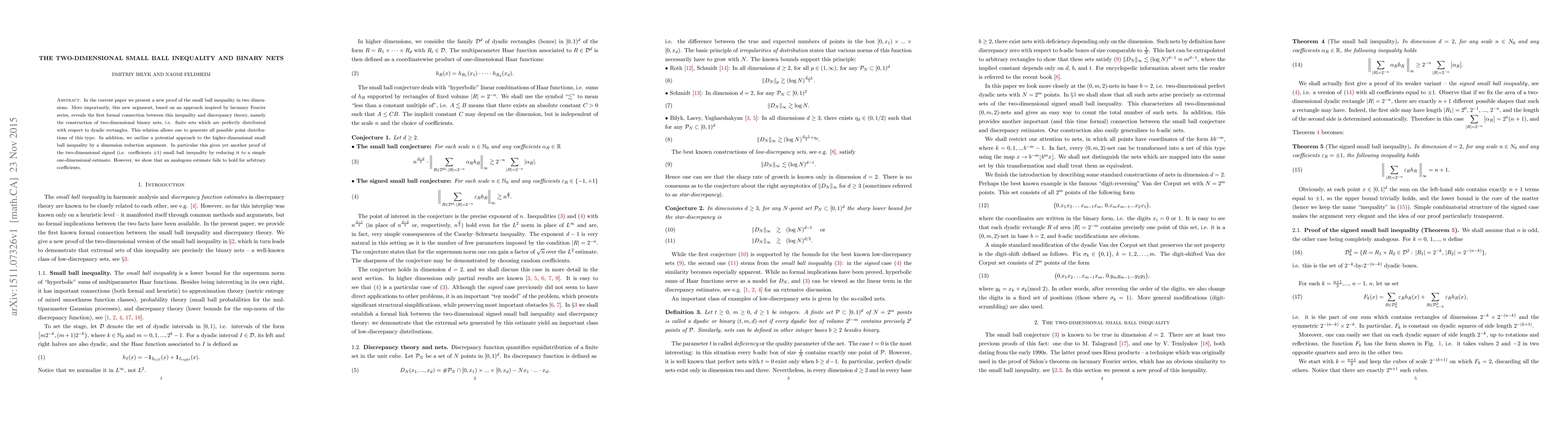 This paper provides a novel proof of the two-dimensional small ball inequality using lacunary Fourier series, establishing a connection to discrepancy theory and the construction of two-dimensional binary nets. It also suggests a dimension reduction approach for higher dimensions, though it finds that an analogous method does not work for arbitrary coefficients.