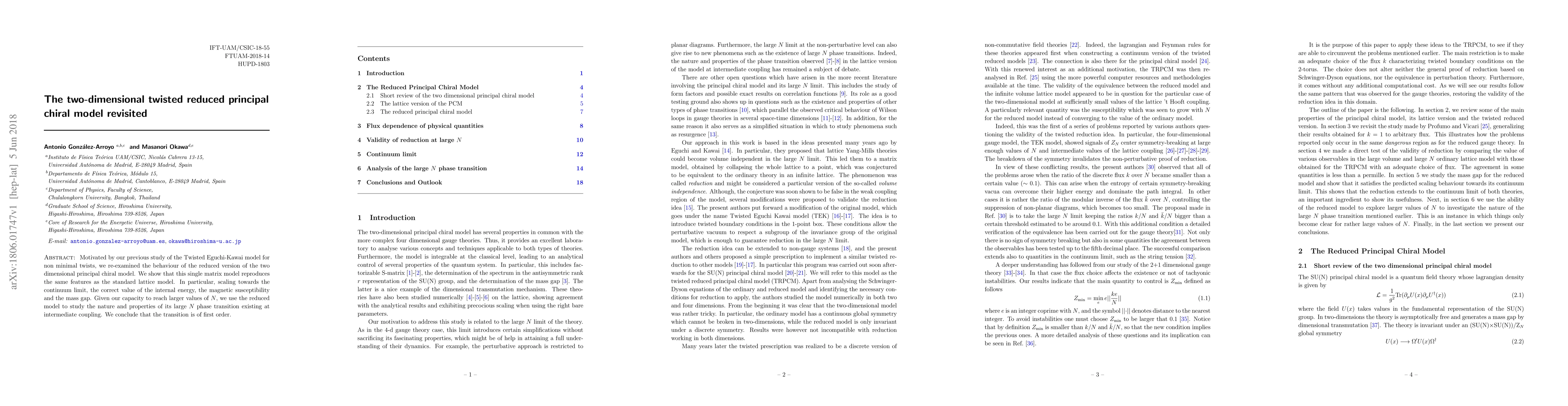 This paper revisits the reduced version of the two-dimensional principal chiral model, demonstrating that it reproduces key features of the standard lattice model, including internal energy, magnetic susceptibility, and mass gap. The study reveals a first-order phase transition at intermediate coupling when analyzed at large matrix sizes $N$.
