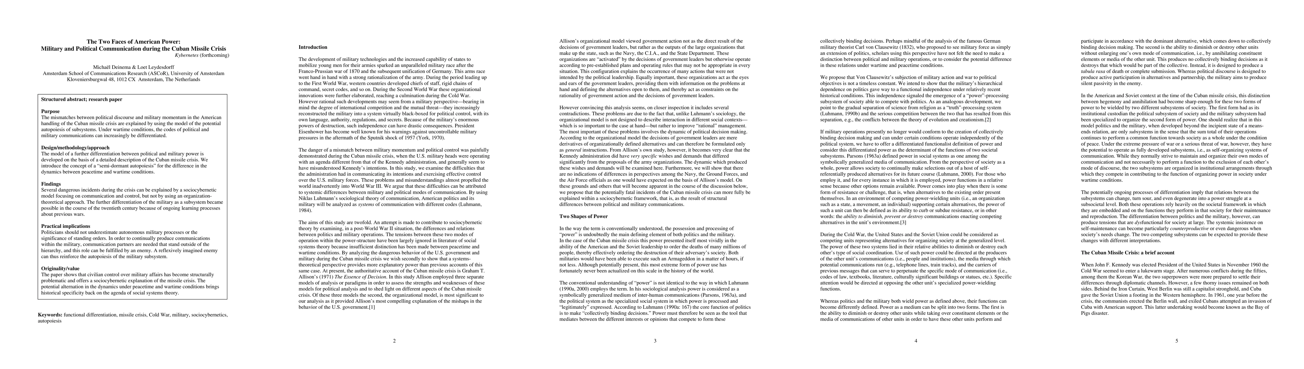 Purpose: The mismatches between political discourse and military momentum in the American handling of the Cuban missile crisis are explained by using the model of the potential autopoiesis of subsystems. Under wartime conditions, the codes of political and military communications can increasingly be differentiated. Design/methodology/approach: The model of a further differentiation between political and military power is developed on the basis of a detailed description of the Cuban missile crisis. We introduce the concept of a "semi-dormant autopoiesis" for the difference in the dynamics between peacetime and wartime conditions. Findings: Several dangerous incidents during the crisis can be explained by a sociocybernetic model focusing on communication and control, but not by using an organization-theoretical approach. The further differentiation of the military as a subsystem became possible in the course of the twentieth century because of ongoing learning processes about previous wars.