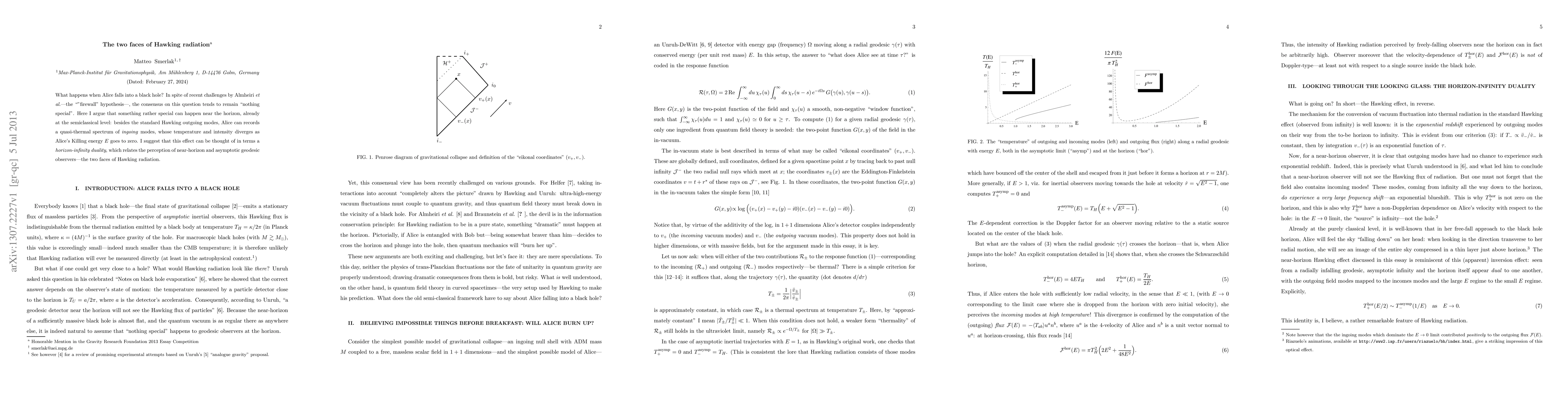 What happens when Alice falls into a black hole? In spite of recent challenges by Almheiri et al. -- the ""firewall" hypothesis -- the consensus on this question tends to remain "nothing special". Here I argue that something rather special can happen near the horizon, already at the semiclassical level: besides the standard Hawking outgoing modes, Alice can records a quasi-thermal spectrum of ingoing modes, whose temperature and intensity diverges as Alice's Killing energy $E$ goes to zero. I suggest that this effect can be thought of in terms a "horizon-infinity duality", which relates the perception of near-horizon and asymptotic geodesic observers -- the two faces of Hawking radiation.