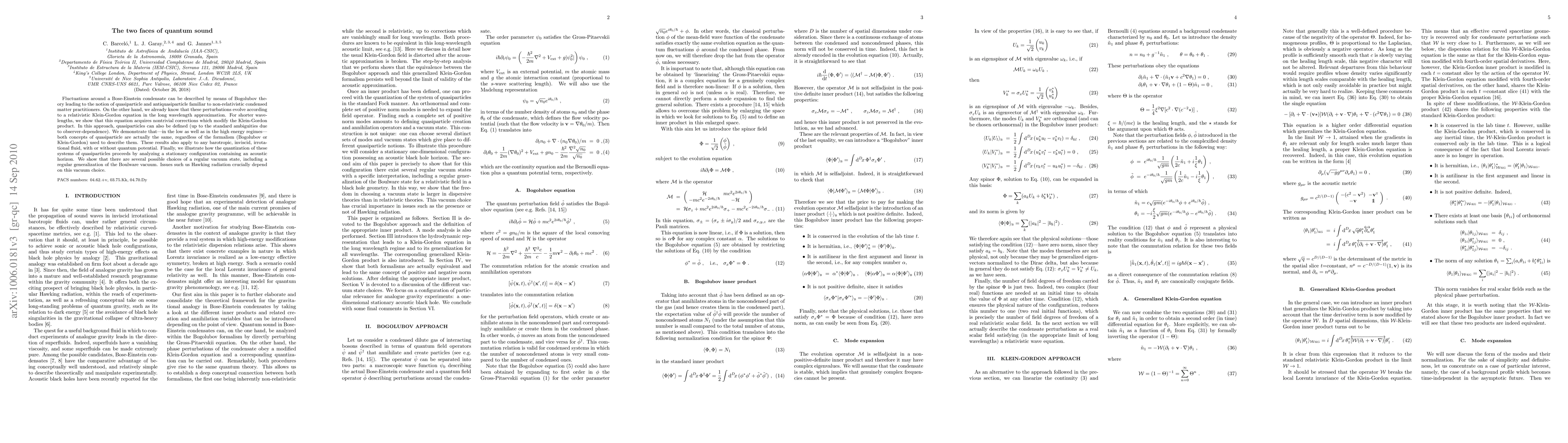 Fluctuations around a Bose-Einstein condensate can be described by means of Bogolubov theory leading to the notion of quasiparticle and antiquasiparticle familiar to non-relativistic condensed matter practitioners. On the other hand, we already know that these perturbations evolve according to a relativistic Klein-Gordon equation in the long wavelength approximation. For shorter wavelengths, we show that this equation acquires nontrivial corrections which modify the Klein-Gordon product. In this approach, quasiparticles can also be defined (up to the standard ambiguities due to observer-dependence). We demonstrate that---in the low as well as in the high energy regimes---both concepts of quasiparticle are actually the same, regardless of the formalism (Bogolubov or Klein-Gordon) used to describe them. These results also apply to any barotropic, inviscid, irrotational fluid, with or without quantum potential. Finally, we illustrate how the quantization of these systems of quasiparticles proceeds by analyzing a stationary configuration containing an acoustic horizon. We show that there are several possible choices of a regular vacuum state, including a regular generalization of the Boulware vacuum. Issues such us Hawking radiation crucially depend on this vacuum choice.