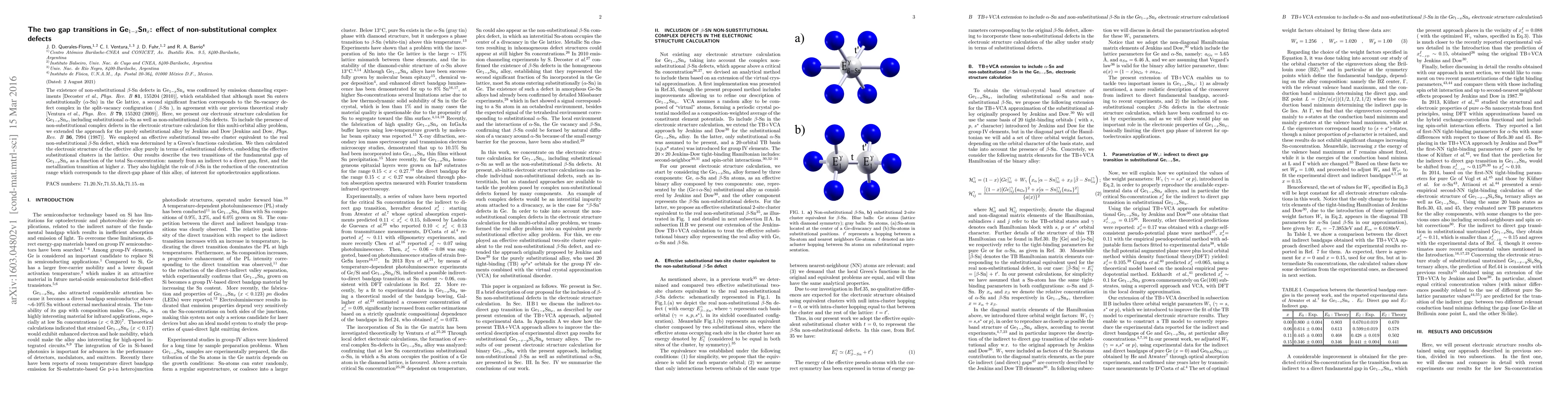 The existence of non-substitutional $\beta$-Sn defects in Ge$_{1-x}$Sn$_{x}$ was confirmed by emission channeling experiments [Decoster et al., Phys. Rev. B 81, 155204 (2010)], which established that although most Sn enters substitutionally ($\alpha$-Sn) in the Ge lattice, a second significant fraction corresponds to the Sn-vacancy defect complex in the split-vacancy configuration ( $\beta$-Sn ), in agreement with our previous theoretical study [Ventura et al., Phys. Rev. B 79, 155202 (2009)]. Here, we present our electronic structure calculation for Ge$_{1-x}$Sn$_{x}$, including substitutional $\alpha$-Sn as well as non-substitutional $\beta$-Sn defects. To include the presence of non-substitutional complex defects in the electronic structure calculation for this multi-orbital alloy problem, we extended the approach for the purely substitutional alloy by Jenkins and Dow [Jenkins and Dow, Phys. Rev. B 36, 7994 (1987)]. We employed an effective substitutional two-site cluster equivalent to the real non-substitutional $\beta$-Sn defect, which was determined by a Green's functions calculation. We then calculated the electronic structure of the effective alloy purely in terms of substitutional defects, embedding the effective substitutional clusters in the lattice. Our results describe the two transitions of the fundamental gap of Ge$_{1-x}$Sn$_{x}$ as a function of the total Sn-concentration: namely from an indirect to a direct gap, first, and the metallization transition at higher $x$. They also highlight the role of $\beta$-Sn in the reduction of the concentration range which corresponds to the direct-gap phase of this alloy, of interest for optoelectronics applications.
