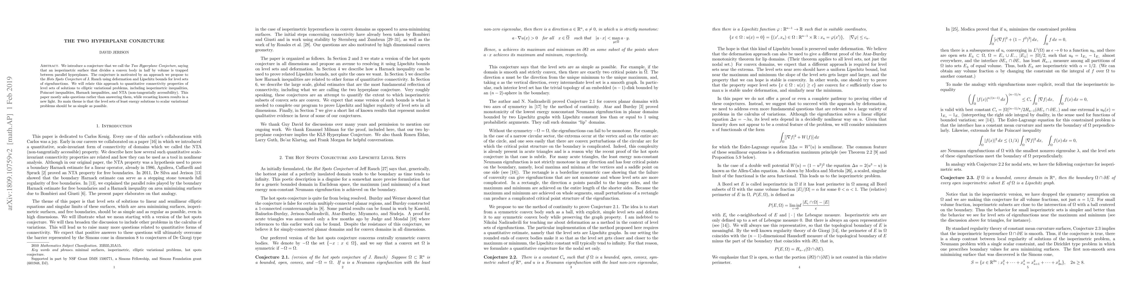 We introduce a conjecture that we call the {\it Two Hyperplane Conjecture}, saying that an isoperimetric surface that divides a convex body in half by volume is trapped between parallel hyperplanes. The conjecture is motivated by an approach we propose to the {\it Hots Spots Conjecture} of J. Rauch using deformation and Lipschitz bounds for level sets of eigenfunctions. We will relate this approach to quantitative connectivity properties of level sets of solutions to elliptic variational problems, including isoperimetric inequalities, Poincar\'e inequalities, Harnack inequalities, and NTA (non-tangentially accessibility). This paper mostly asks questions rather than answering them, while recasting known results in a new light. Its main theme is that the level sets of least energy solutions to scalar variational problems should be as simple as possible.