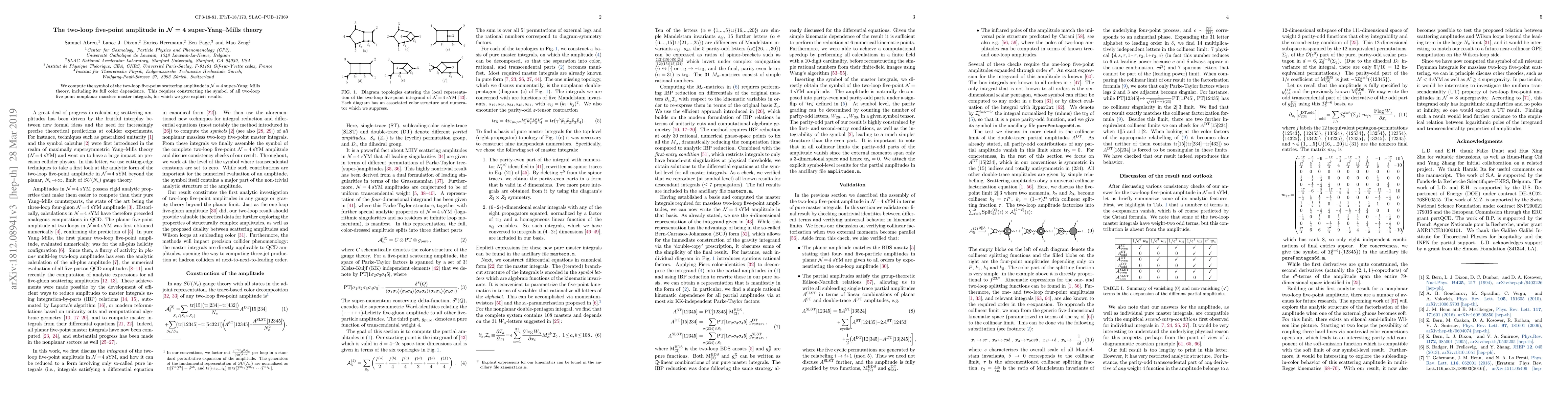 Summary: This research computes the symbol of the two-loop five-point amplitude in $\mathcal{N}=4$ super-Yang-Mills theory, presenting explicit results for the full color-dependent symbol and the construction of all two-loop five-point nonplanar massless master integrals.