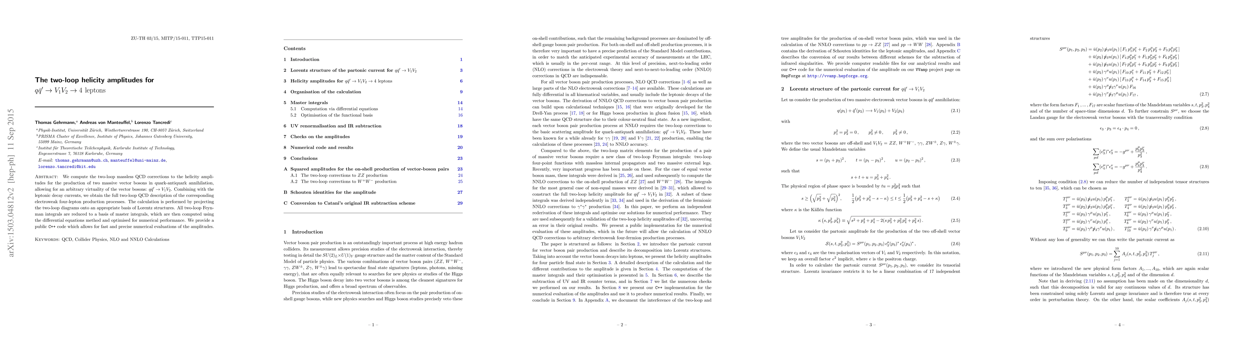 This paper computes two-loop massless QCD corrections to the helicity amplitudes for the production of two massive vector bosons in quark-antiquark annihilation, leading to four-lepton final states. The authors provide a public C++ code for precise numerical evaluations of the resulting amplitudes.