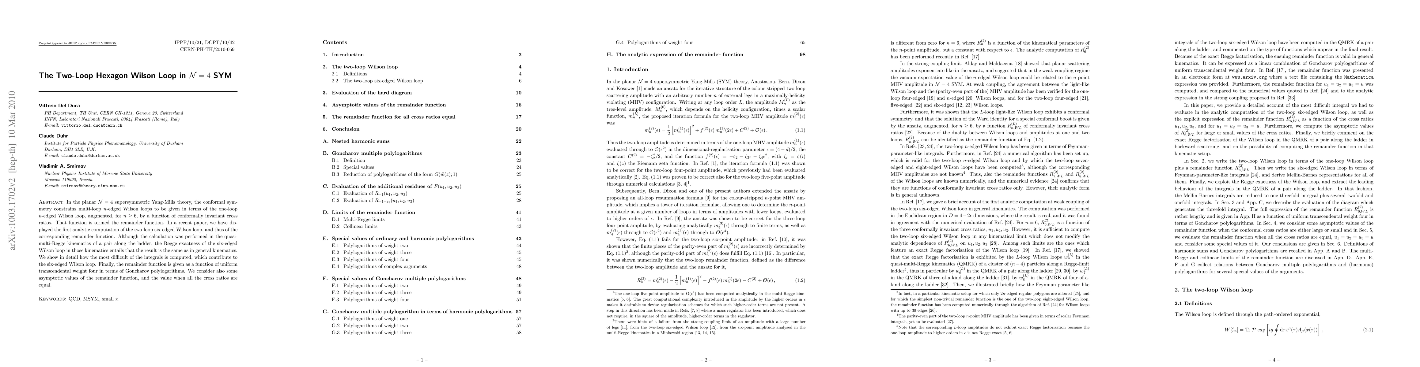 This paper computes the two-loop six-edged Wilson loop in N=4 SYM, revealing the first analytic result for the associated remainder function, which is expressed in terms of Goncharov polylogarithms. The calculation confirms the Regge exactness of the result across different kinematics.