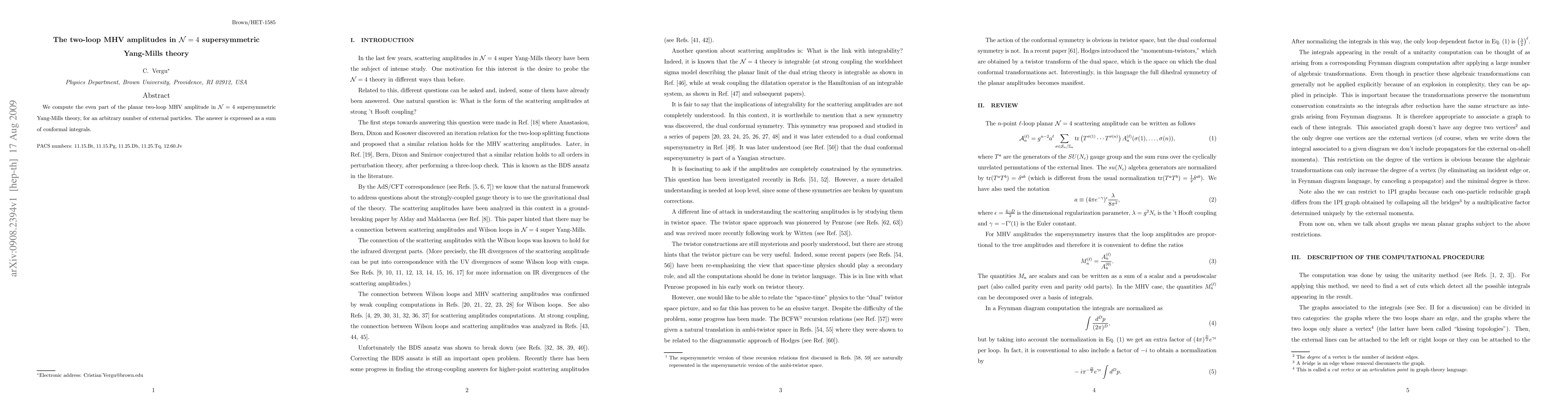 This paper computes the even part of the planar two-loop maximally helicity violating (MHV) amplitude in N=4 supersymmetric Yang-Mills theory for any number of external particles, expressing the result as a sum of conformal integrals. The findings are significant for understanding higher-loop corrections in supersymmetric gauge theories.
