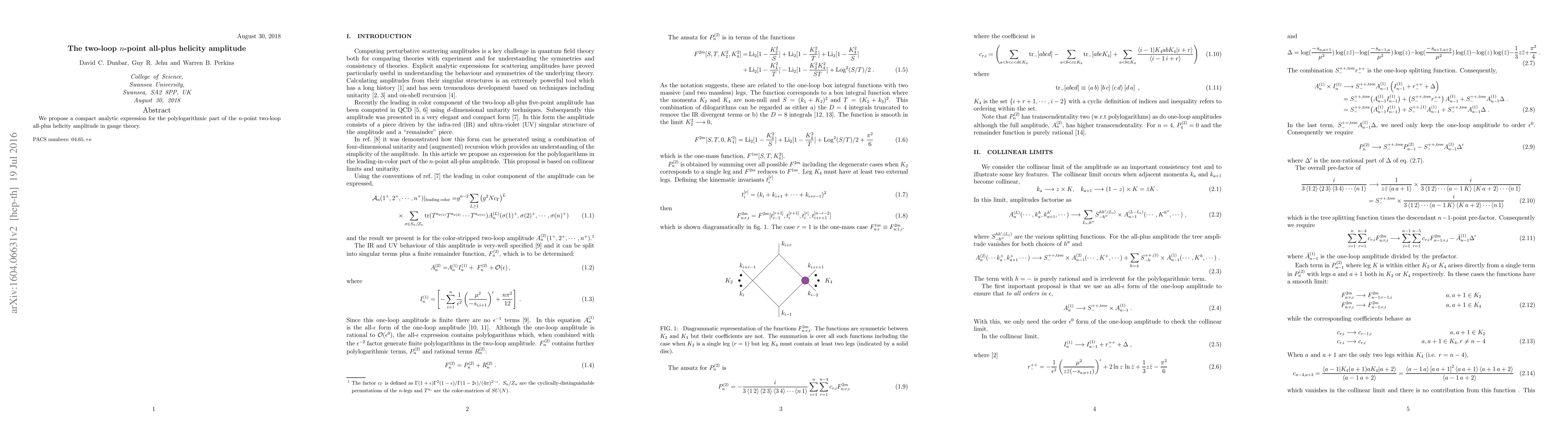 This research presents a succinct analytic expression for the polylogarithmic component of the n-point two-loop all-plus helicity amplitude in gauge theory, aiming to simplify calculations in high-energy physics. The proposed formula facilitates more efficient computations in theoretical particle physics.