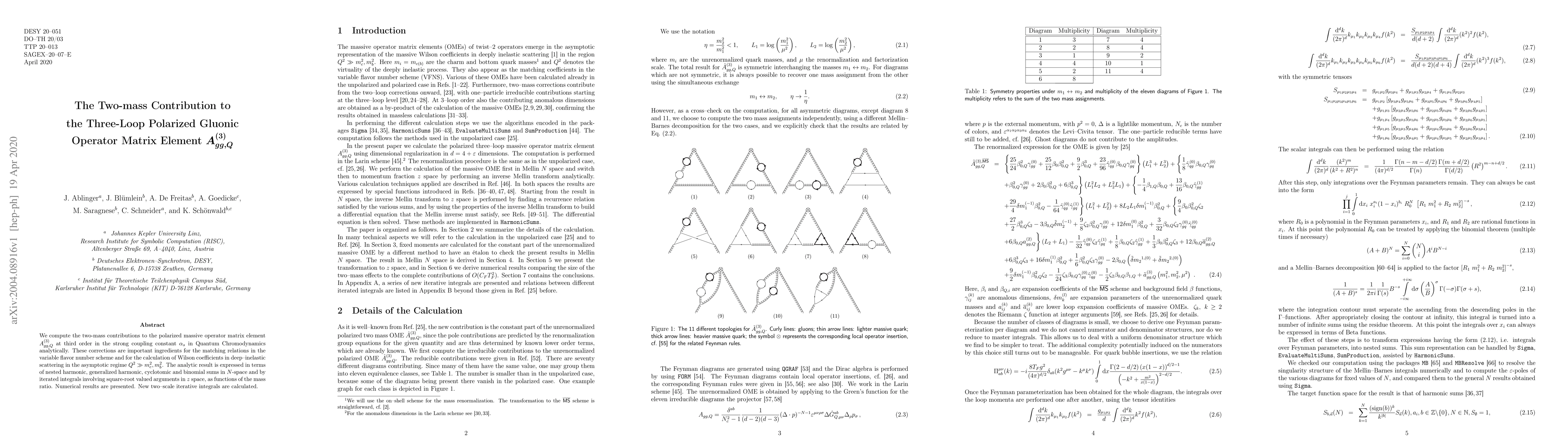 Researchers analytically compute two-mass contributions to a key matrix element in Quantum Chromodynamics, essential for understanding deep-inelastic scattering, and find it expressed through various mathematical sums and integrals.