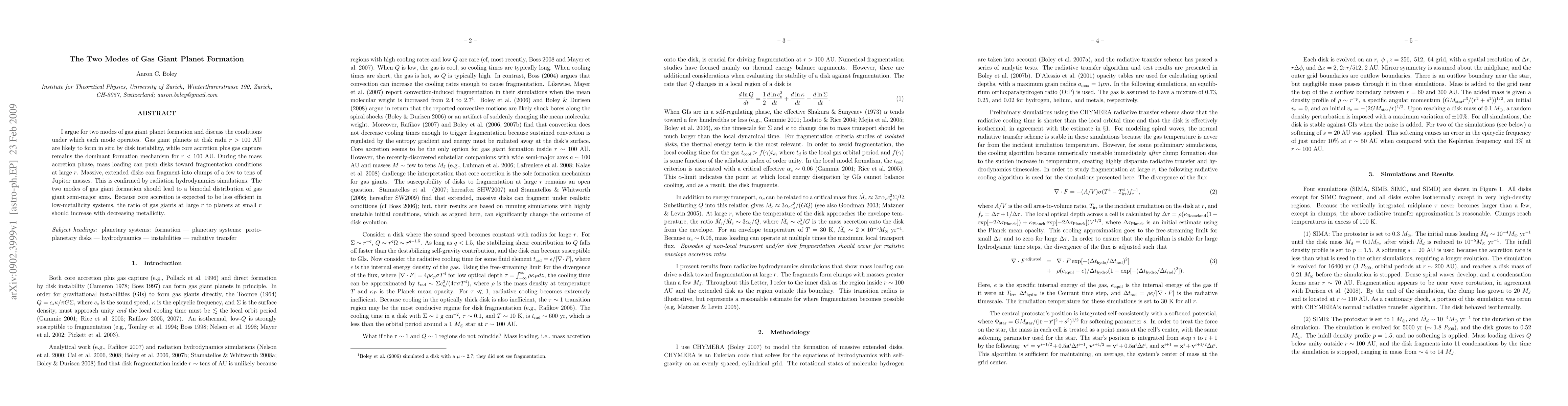 This paper proposes two distinct modes for gas giant planet formation: disk instability for planets at radii $r>100$ AU and core accretion for $r<100$ AU. It suggests that massive, extended disks can fragment into gas giant clumps, confirmed by simulations, leading to a bimodal distribution of gas giant semi-major axes.