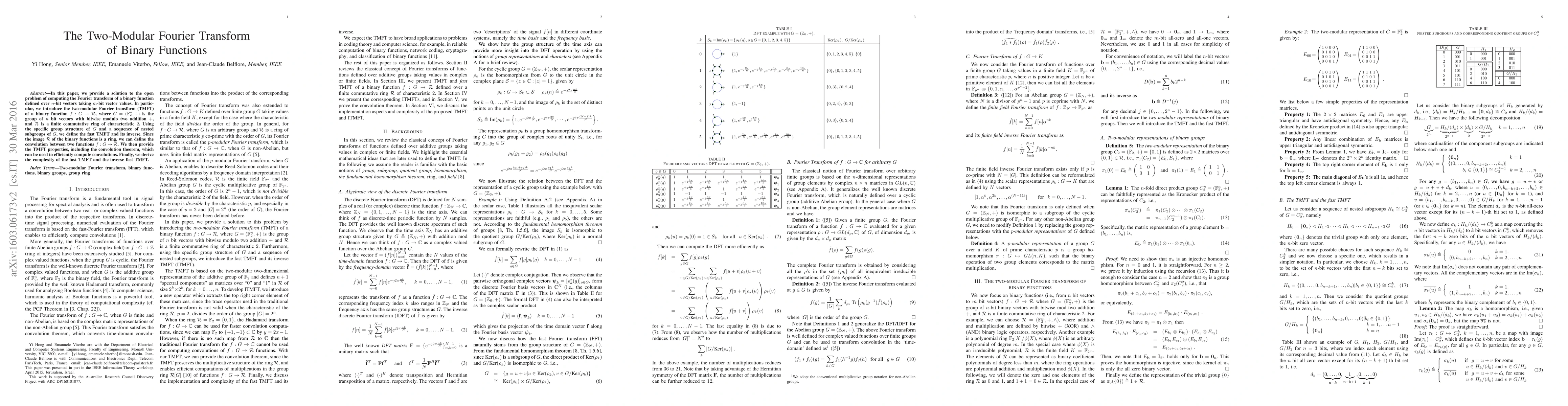 This paper introduces the two-modular Fourier transform (TMFT) for binary functions defined over $n$-bit vectors, providing a fast algorithm and its inverse. It leverages the group structure of $n$ bit vectors and convolution properties to efficiently compute convolutions and presents the computational complexity of the proposed transform.