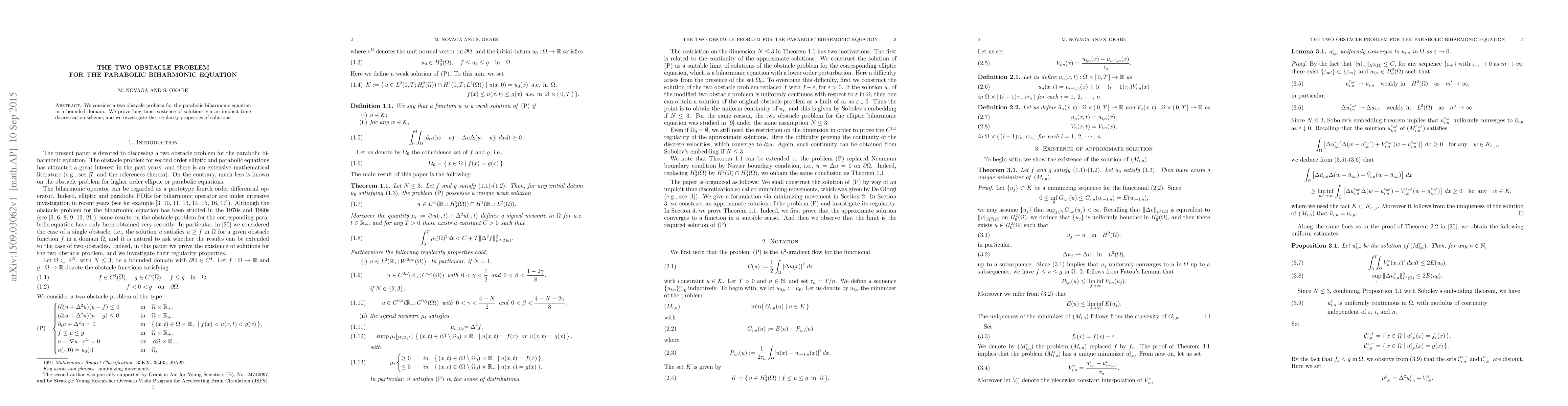 This paper studies a two obstacle problem for the parabolic biharmonic equation, proving long-time existence of solutions using an implicit time discretization scheme and examining the regularity properties of these solutions.
