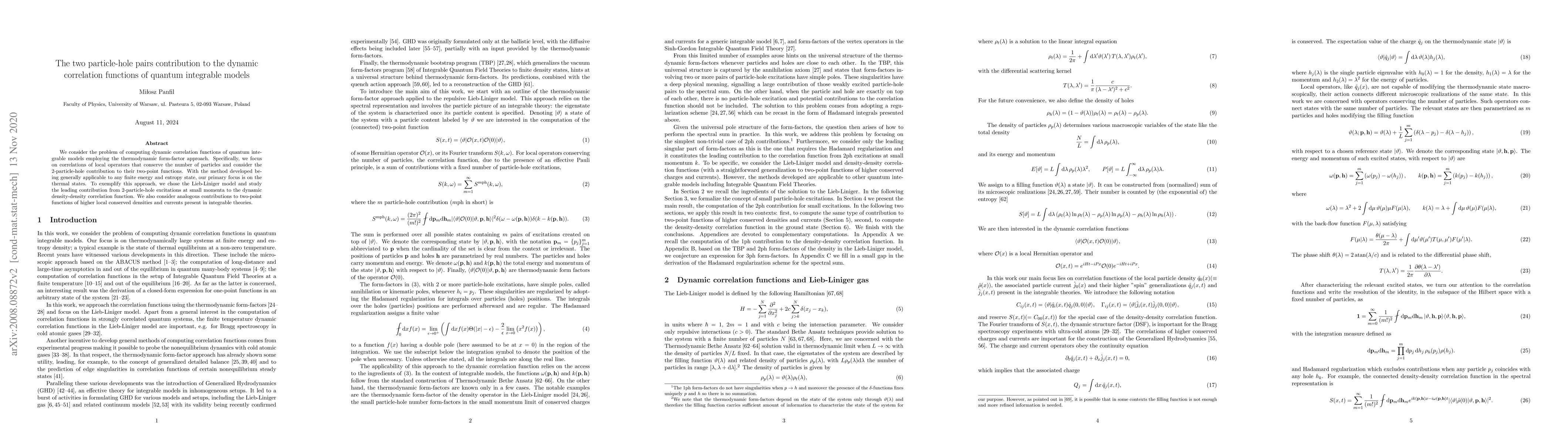 This paper develops a thermodynamic form-factor approach to compute dynamic correlation functions in quantum integrable models, focusing on the 2-particle-hole pair contributions. The method is demonstrated using the Lieb-Liniger model to analyze the leading thermal contributions to density-density and higher conserved density-current correlation functions.