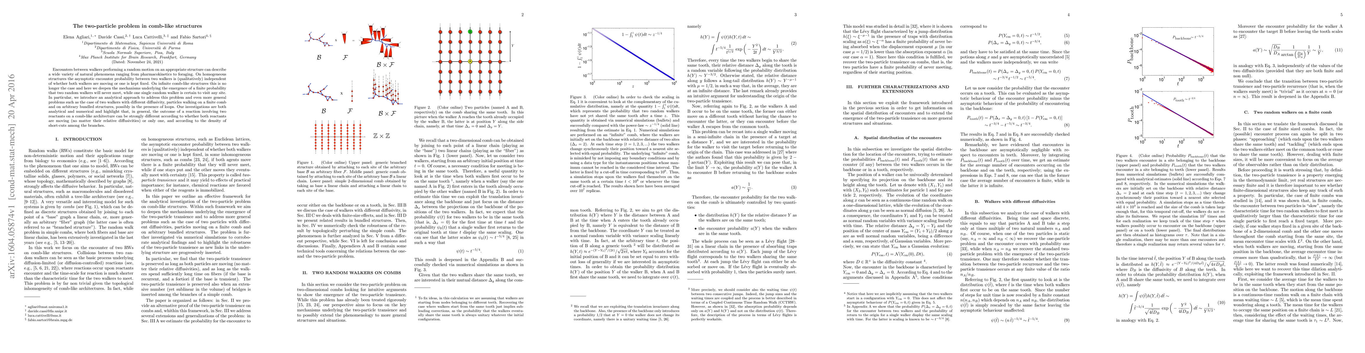 Researchers studied how random walkers move on comb-like structures and found that their movement affects the probability of meeting, with varying outcomes depending on walker speed and structure density.