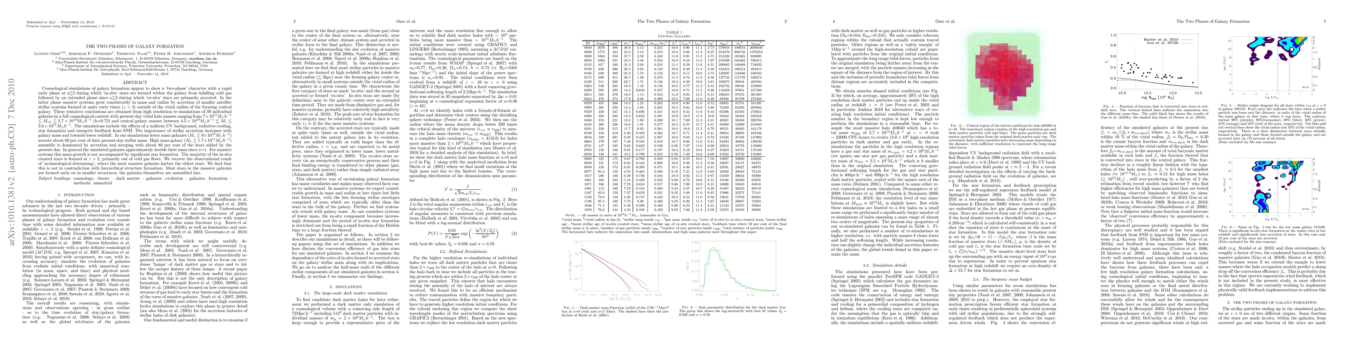 Cosmological simulations of galaxy formation appear to show a two-phase character with a rapid early phase at z>2 during which in-situ stars are formed within the galaxy from infalling cold gas followed by an extended phase since z<3 during which ex-situ stars are primarily accreted. In the latter phase massive systems grow considerably in mass and radius by accretion of smaller satellite stellar systems formed at quite early times (z>3) outside of the virial radius of the forming central galaxy. These tentative conclusions are obtained from high resolution re-simulations of 39 individual galaxies in a full cosmological context with present-day virial halo masses ranging from 7e11 M_sun h^-1 < M_vir < 2.7e13 M_sun h^-1 and central galaxy masses between 4.5e10 M_sun h^-1 < M_* < 3.6e11 M_sun h^-1. The simulations include the effects of a uniform UV background, radiative cooling, star formation and energetic feedback from SNII. The importance of stellar accretion increases with galaxy mass and towards lower redshift. In our simulations lower mass galaxies ($M_* < 9e10 M_sun h^-1) accrete about 60 per cent of their present-day stellar mass. High mass galaxy ($M_* > 1.7e11 M_sun h^-1) assembly is dominated by accretion and merging with about 80 per cent of the stars added by the present-day. In general the simulated galaxies approximately double their mass since z=1. For massive systems this mass growth is not accompanied by significant star formation. The majority of the in-situ created stars is formed at z>2, primarily out of cold gas flows. We recover the observational result of archaeological downsizing, where the most massive galaxies harbor the oldest stars. We find that this is not in contradiction with hierarchical structure formation. Most stars in the massive galaxies are formed early on in smaller structures, the galaxies themselves are assembled late.