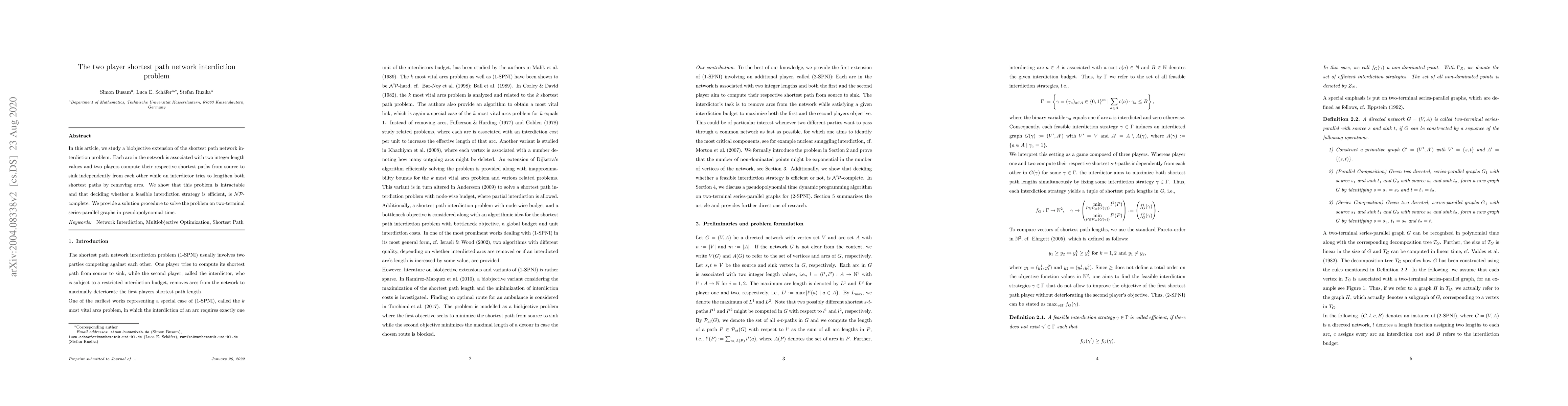 In this article, we study a biobjective extension of the shortest path network interdiction problem. Each arc in the network is associated with two integer length values and two players compute their respective shortest paths from source to sink independently from each other while an interdictor tries to lengthen both shortest paths by removing arcs. We show that this problem is intractable and that deciding whether a feasible interdiction strategy is efficient, is NP- complete. We provide a solution procedure to solve the problem on two-terminal series-parallel graphs in pseudopolynomial time.