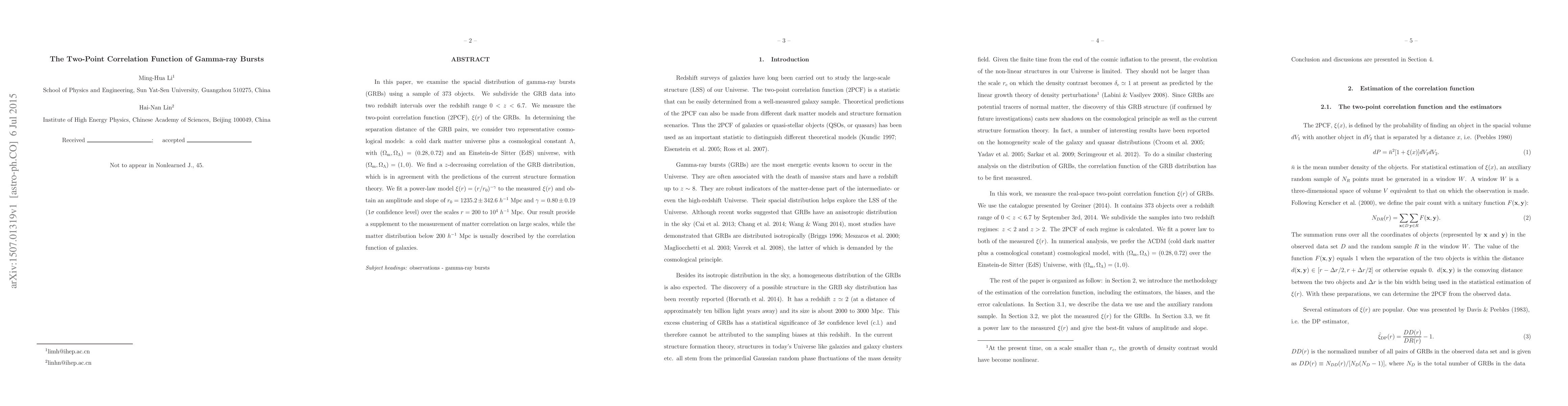 This study analyzes the spatial distribution of gamma-ray bursts (GRBs) across 373 objects, divided into two redshift intervals. It measures the two-point correlation function (2PCF), finding a decreasing correlation with redshift, consistent with current structure formation theory. The research fits a power-law model to the 2PCF, yielding an amplitude and slope of r0=1235.2±342.6 h^-1 Mpc and γ=0.80±0.19, over scales of 200 to 10^4 h^-1 Mpc. The findings contribute to matter correlation measurements on large scales.