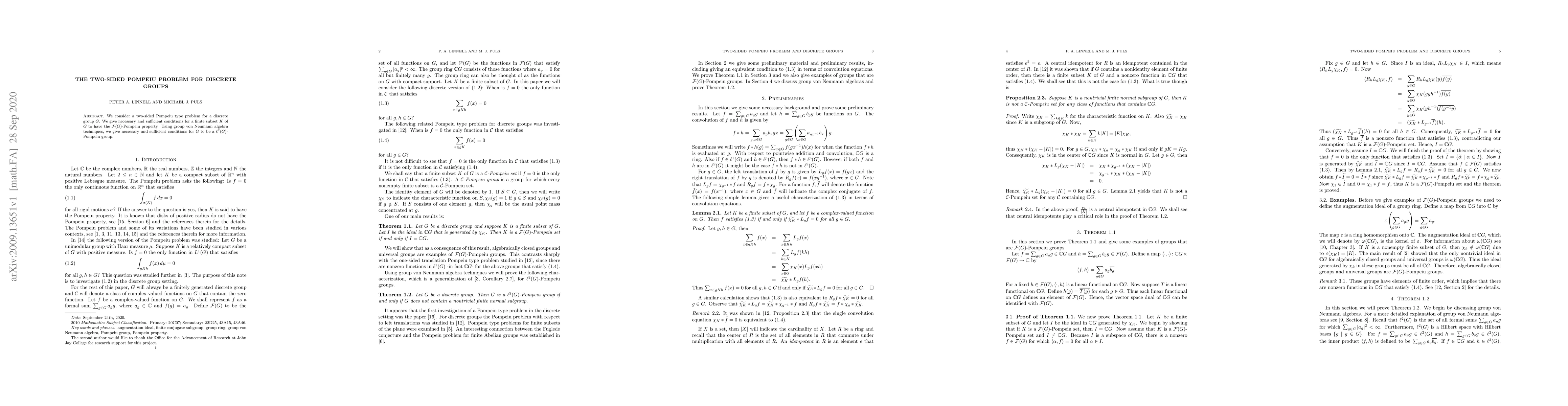 We consider a two-sided Pompeiu type problem for a discrete group $G$. We give necessary and sufficient conditions for a finite set $K$ of $G$ to have the $\mathcal{F}(G)$-Pompeiu property. Using group von Neumann algebra techniques, we give necessary and sufficient conditions for $G$ to be a $\ell^2(G)$-Pompeiu group