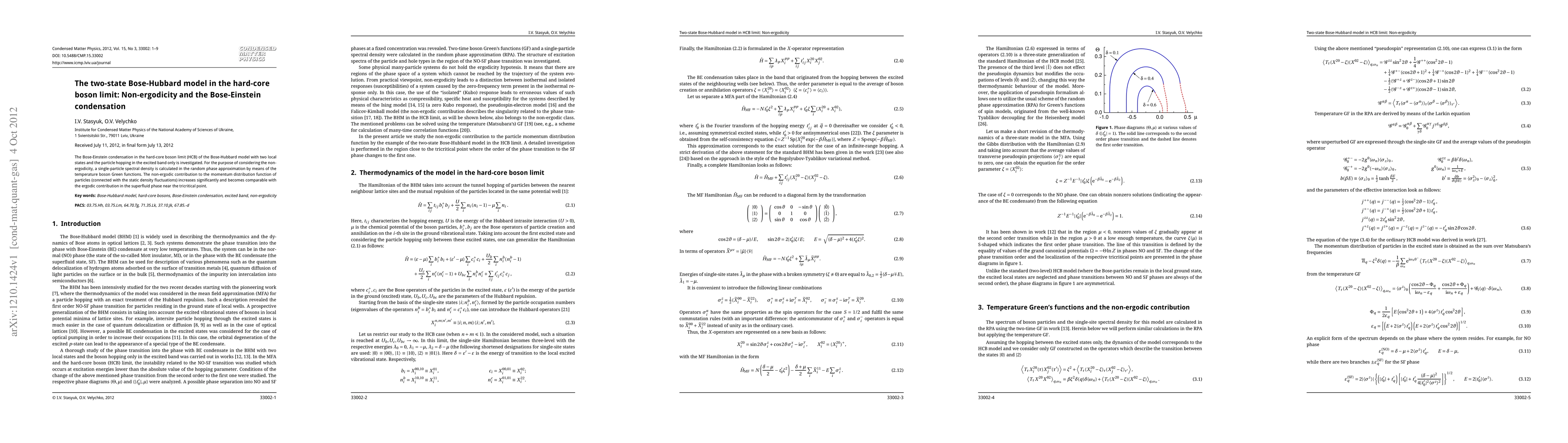 The Bose-Einstein condensation in the hard-core boson limit (HCB) of the Bose-Hubbard model with two local states and the particle hopping in the excited band only is investigated. For the purpose of considering the non-ergodicity, a single-particle spectral density is calculated in the random phase approximation by means of the temperature boson Green functions. The non-ergodic contribution to the momentum distribution function of particles (connected with the static density fluctuations) increases significantly and becomes comparable with the ergodic contribution in the superfluid phase near the tricritical point.