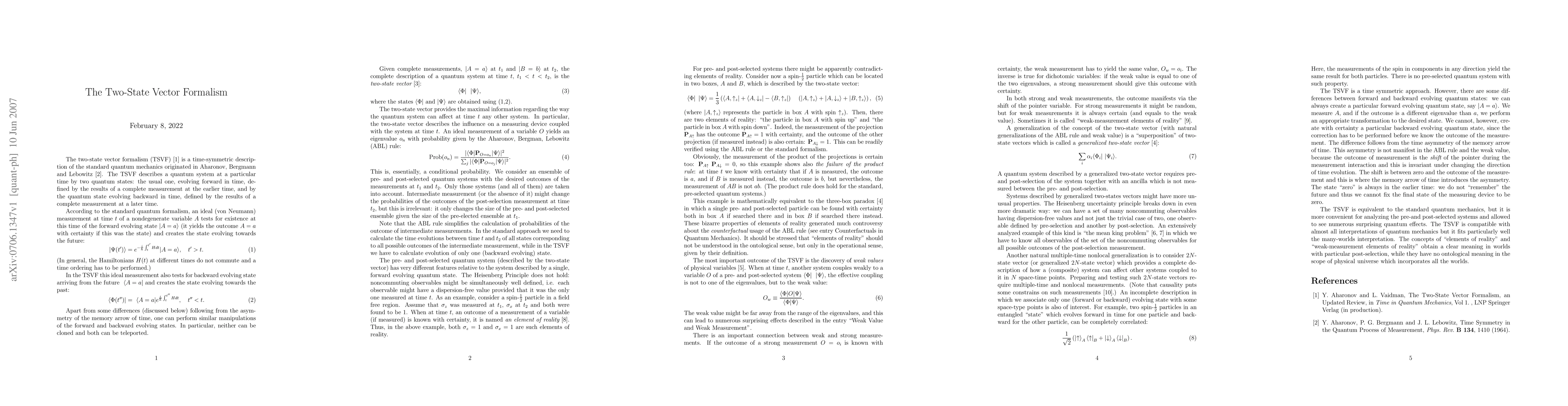 The two-state vector formalism (TSVF), the time-symmetric description of the standard quantum mechanics originated by Aharonov, Bergmann and Lebowitz is reviewed. The TSVF describes a quantum system at a particular time by two quantum states: the usual one, evolving forward in time, defined by the results of a complete measurement at the earlier time, and by the quantum state evolving backward in time, defined by the results of a complete measurement at a later time.