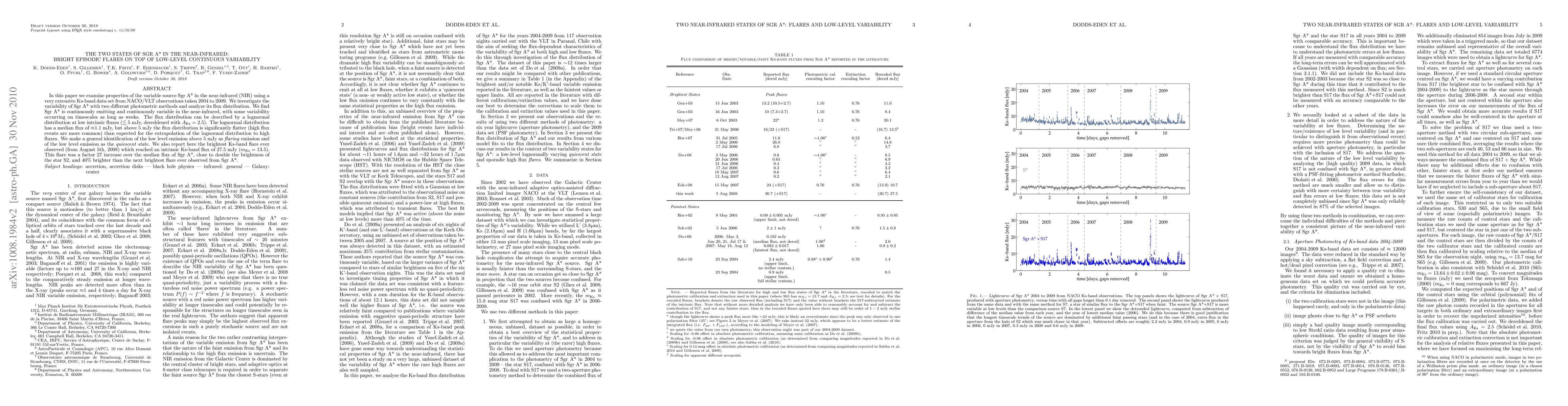 In this paper we examine properties of the variable source Sgr A* in the near-infrared (NIR) using a very extensive Ks-band data set from NACO/VLT observations taken 2004 to 2009. We investigate the variability of Sgr A* with two different photometric methods and analyze its flux distribution. We find Sgr A* is continuously emitting and continuously variable in the near-infrared, with some variability occurring on timescales as long as weeks. The flux distribution can be described by a lognormal distribution at low intrinsic fluxes (<~5 mJy, dereddened with A_{Ks}=2.5). The lognormal distribution has a median flux of approximately 1.1 mJy, but above 5 mJy the flux distribution is significantly flatter (high flux events are more common) than expected for the extrapolation of the lognormal distribution to high fluxes. We make a general identification of the low level emission above 5 mJy as flaring emission and of the low level emission as the quiescent state. We also report here the brightest Ks-band flare ever observed (from August 5th, 2008) which reached an intrinsic Ks-band flux of 27.5 mJy (m_{Ks}=13.5). This flare was a factor 27 increase over the median flux of Sgr A*, close to double the brightness of the star S2, and 40% brighter than the next brightest flare ever observed from Sgr~A*.